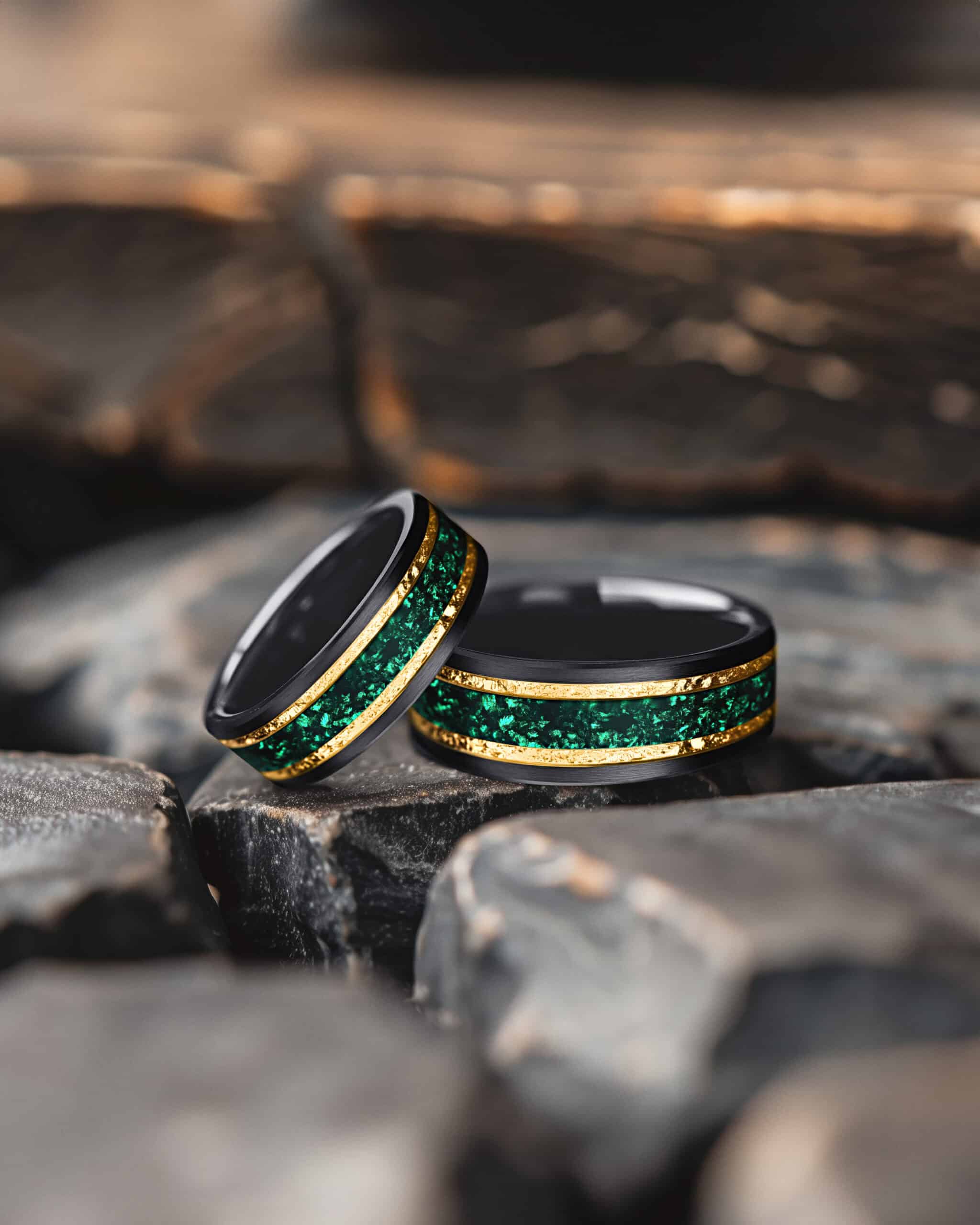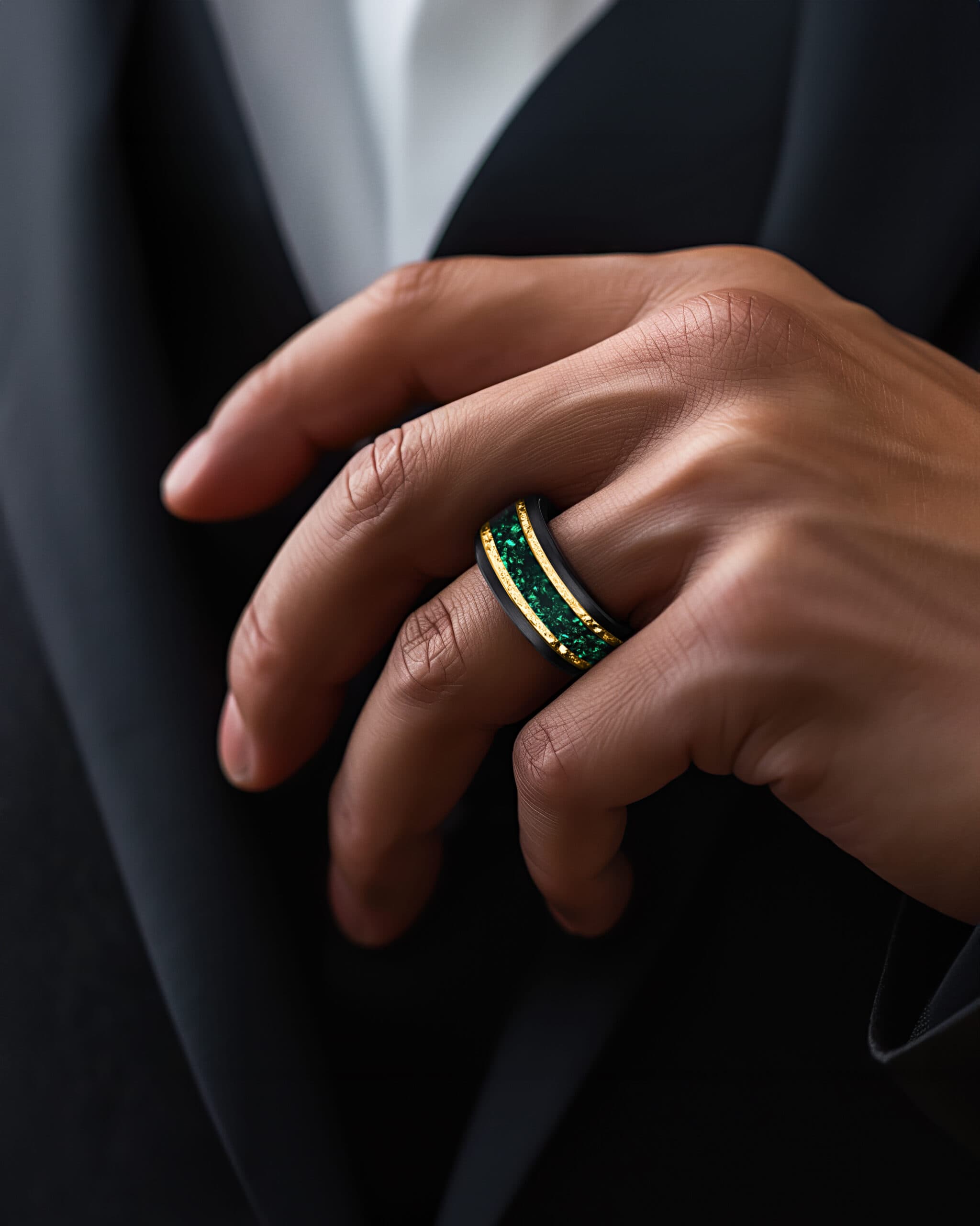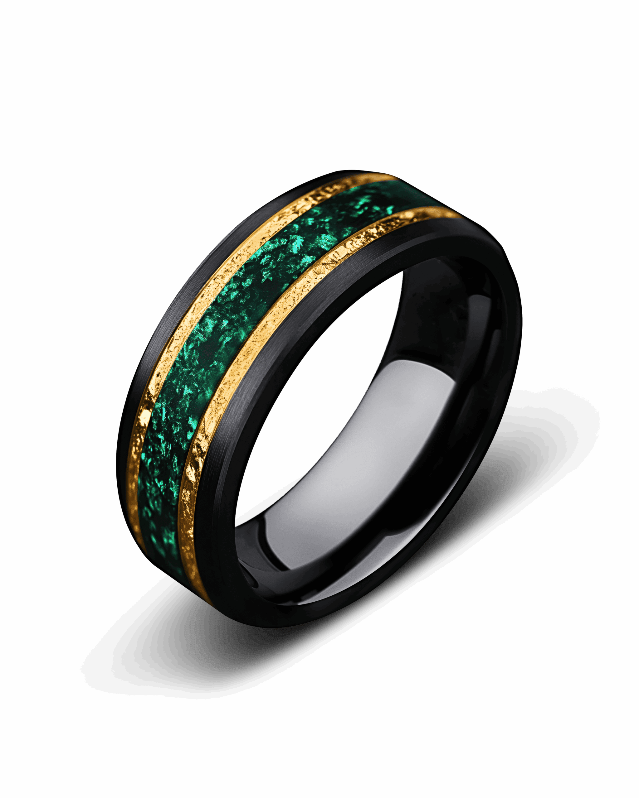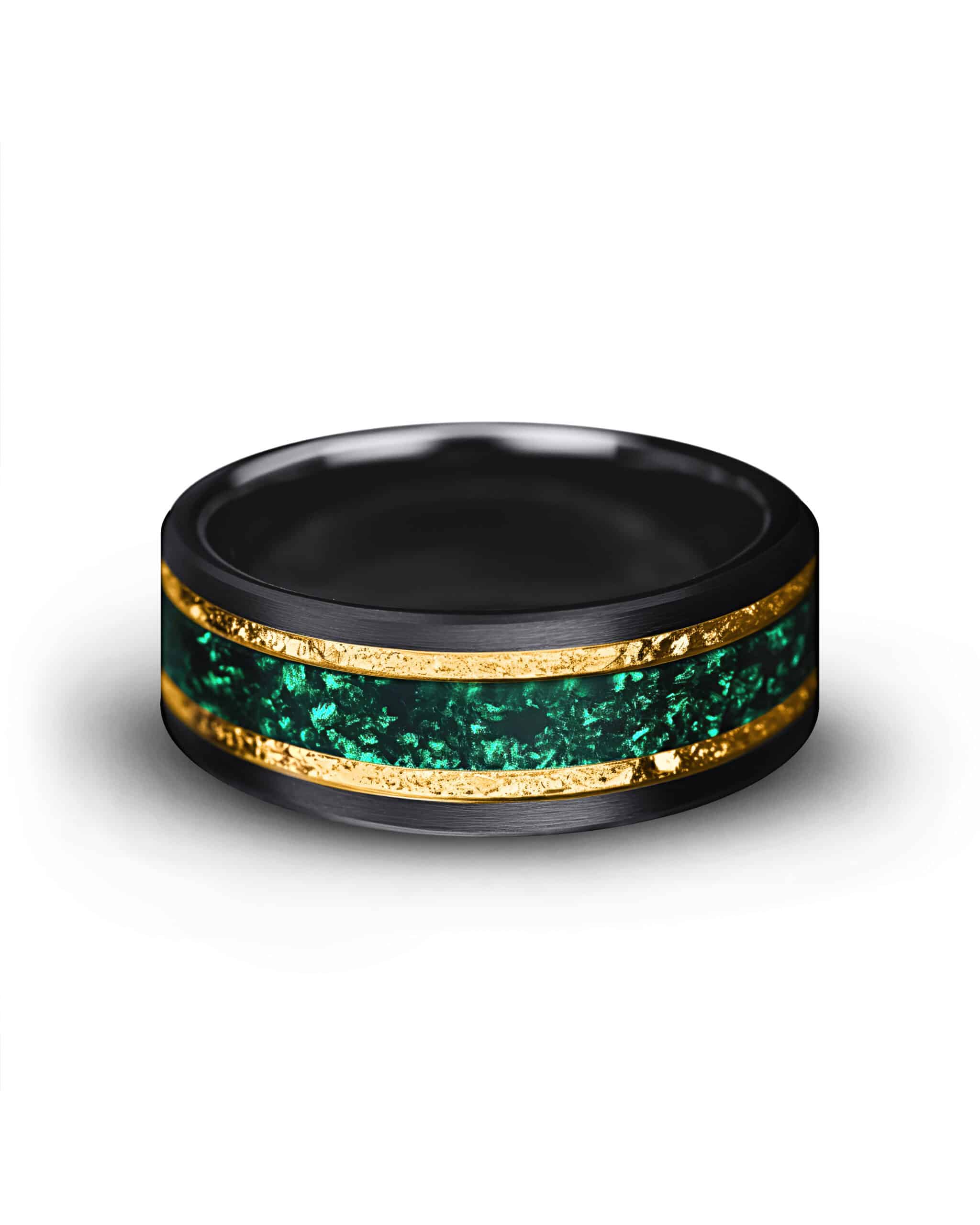 Emerantis brings regal elegance to a bold form. The beveled black tungsten band creates a sleek frame, while the center glows with a vivid crushed emerald inlay, alive with rich green tones. Framed by radiant gold-plated lines, the design unites strength, brilliance, and timeless sophistication.