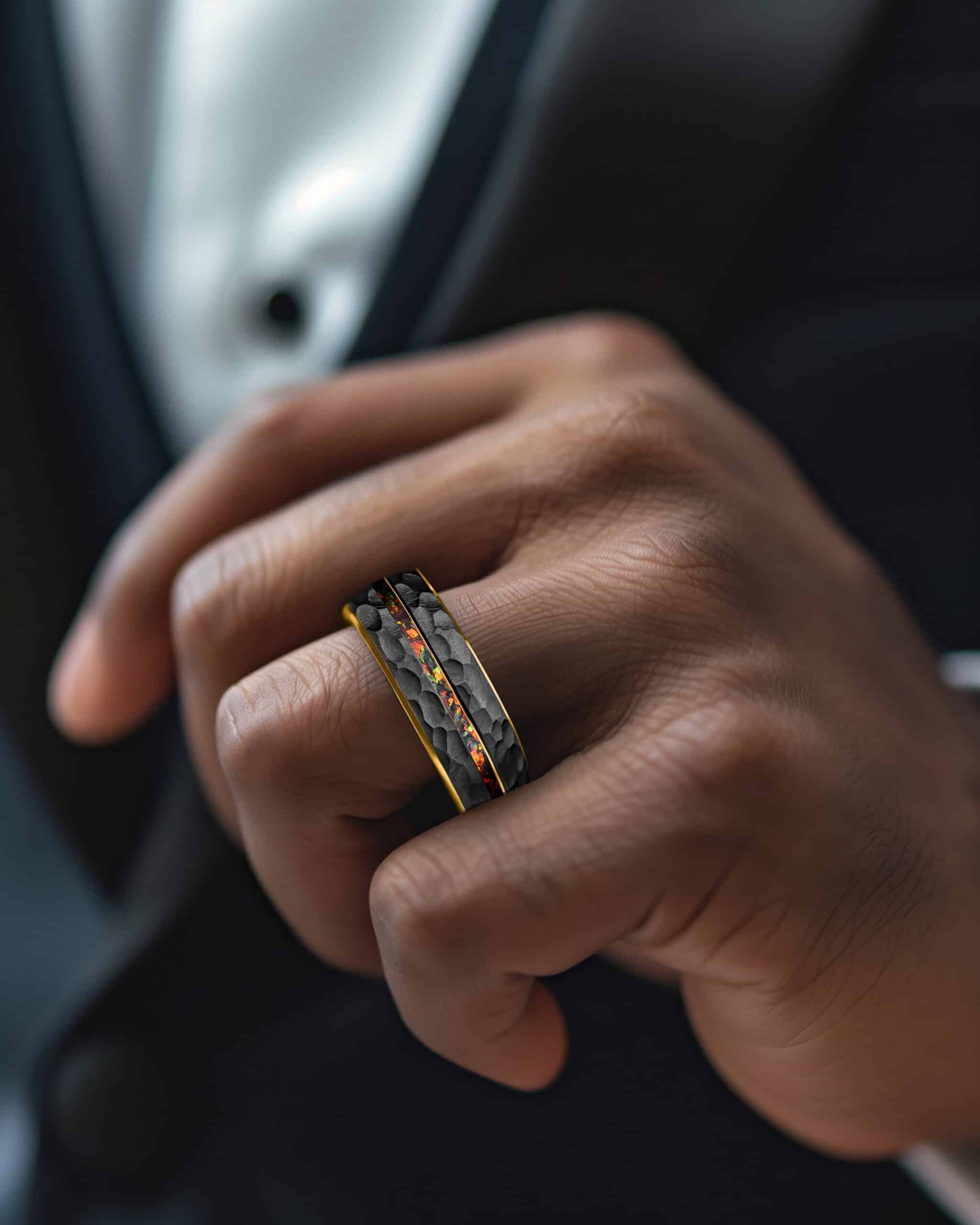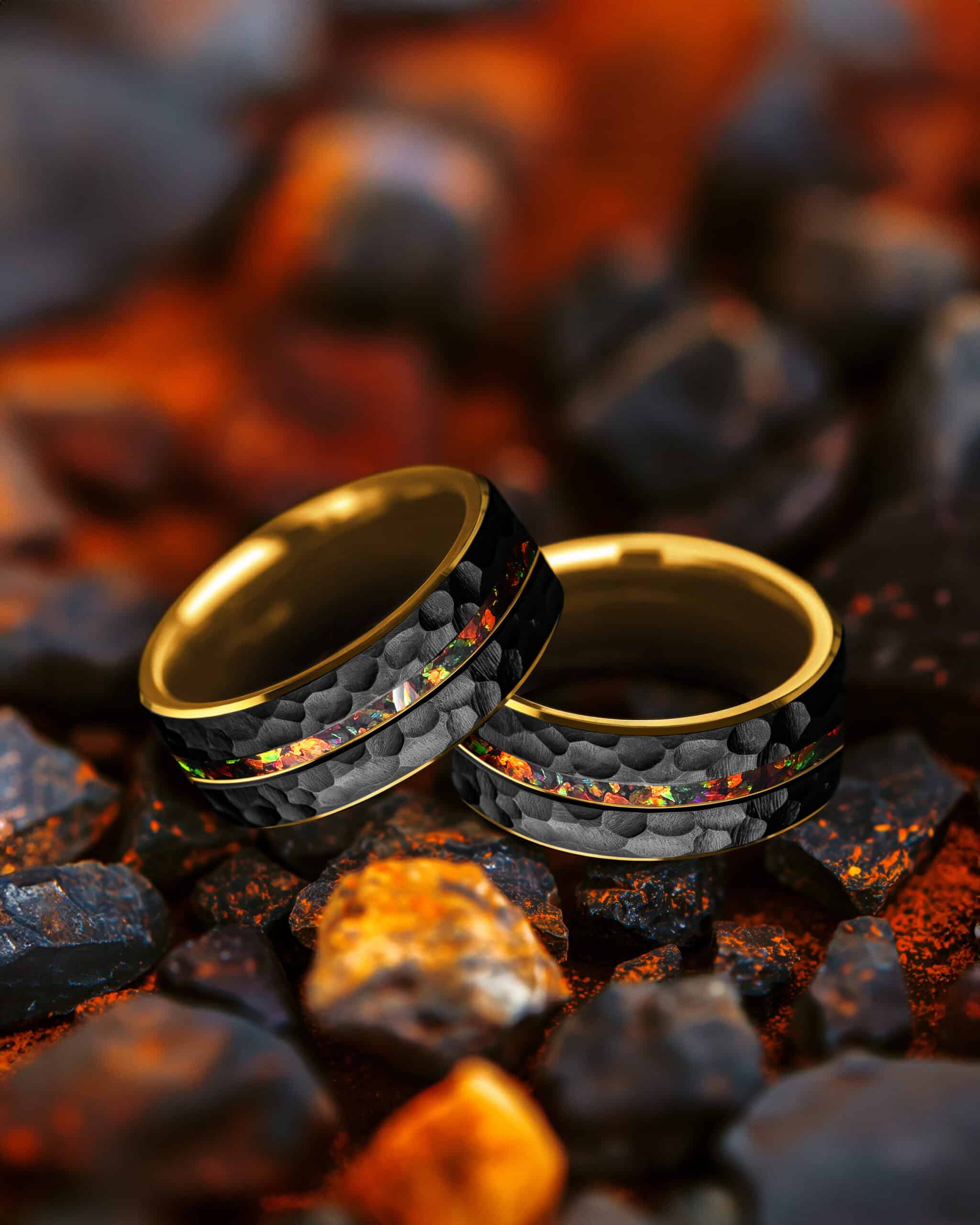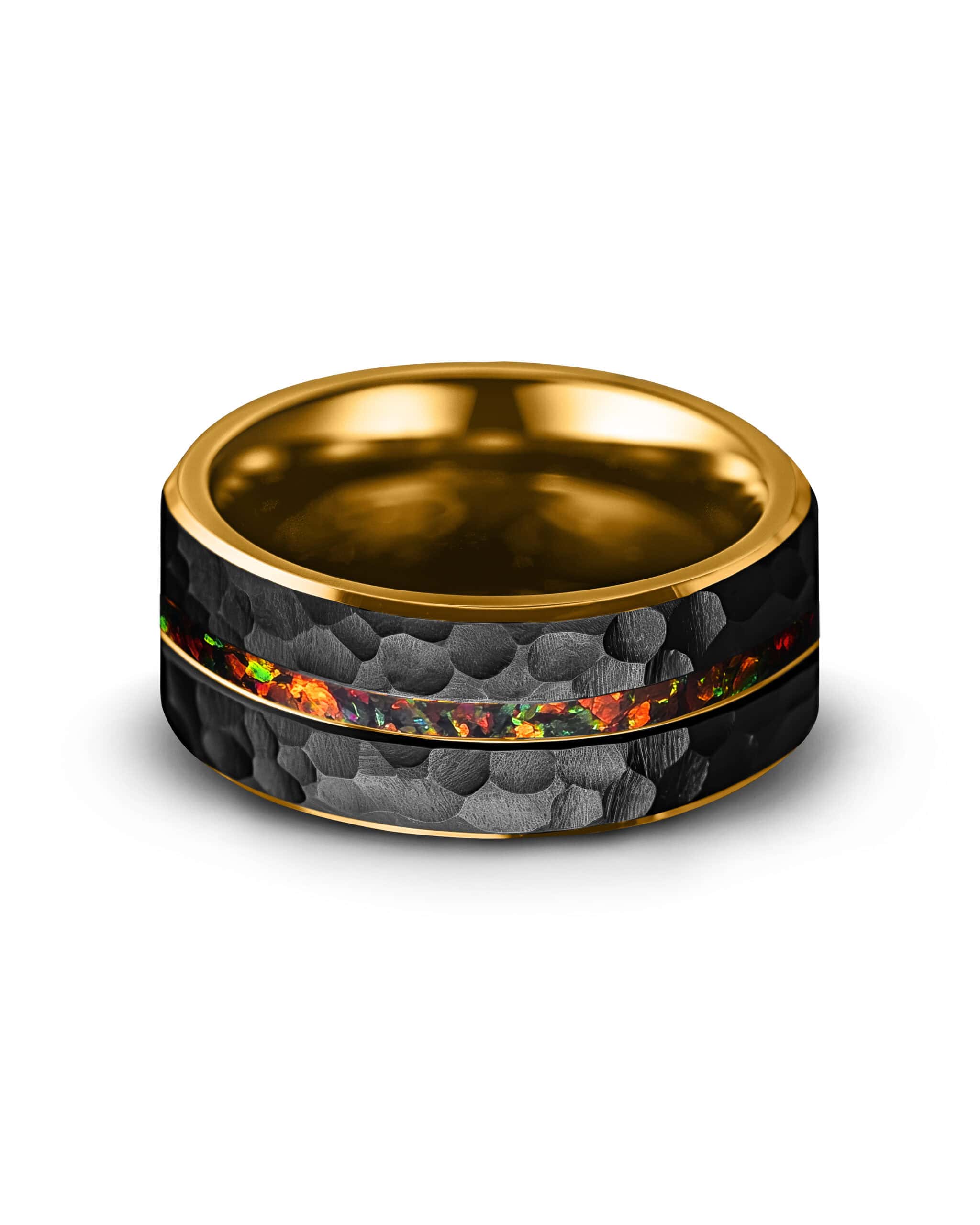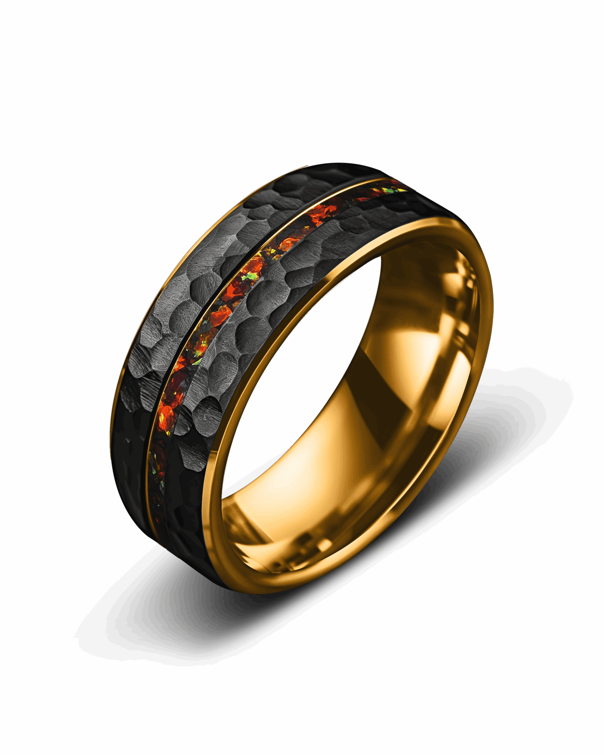 The Inferno ring twists together fire and shadow in a striking form. A vivid crushed fire opal inlay glows at its core, framed by a rugged brushed black hammered finish that evokes raw strength. Gold bevel edges add refinement and balance, creating a design that spirals between untamed energy and timeless elegance.