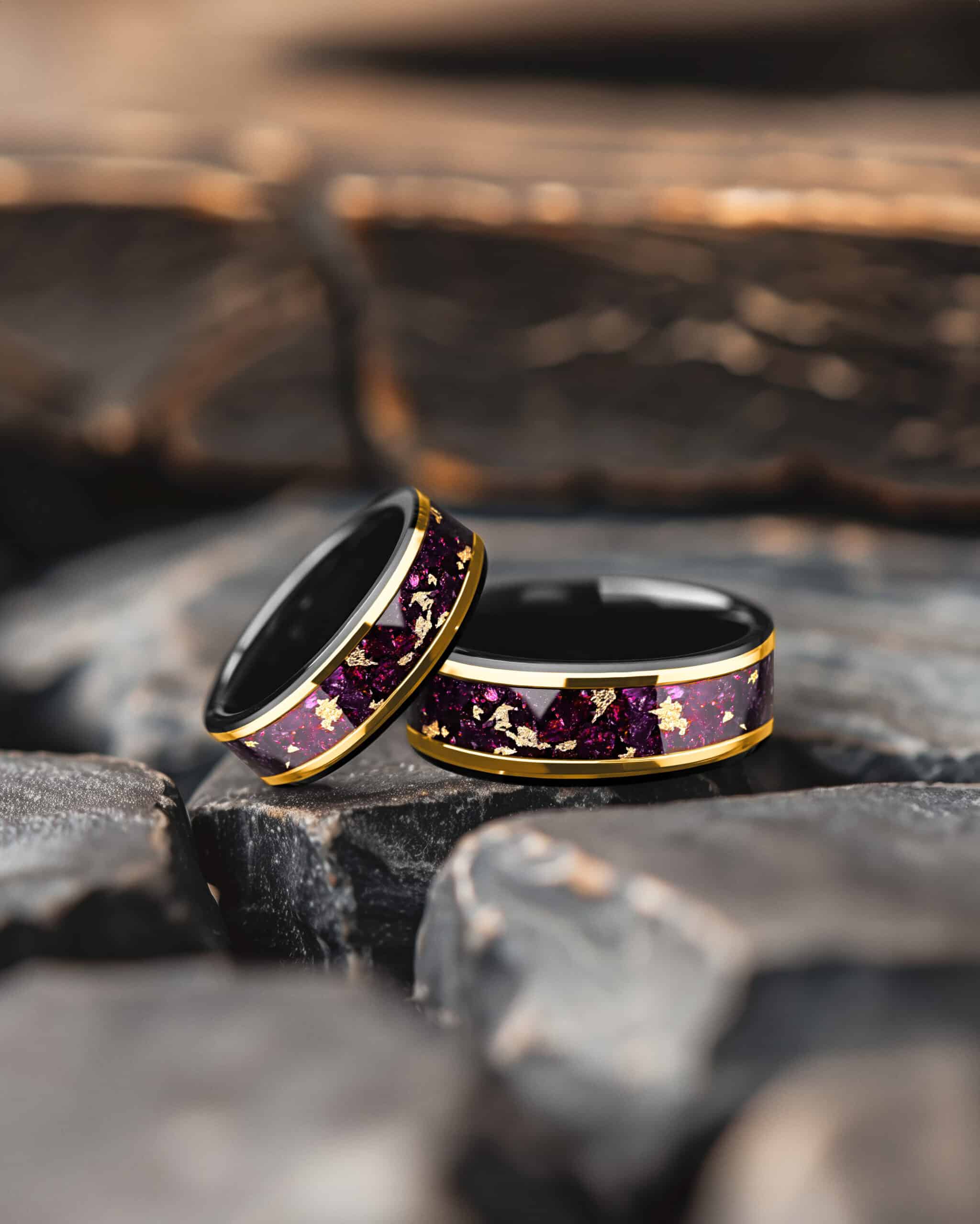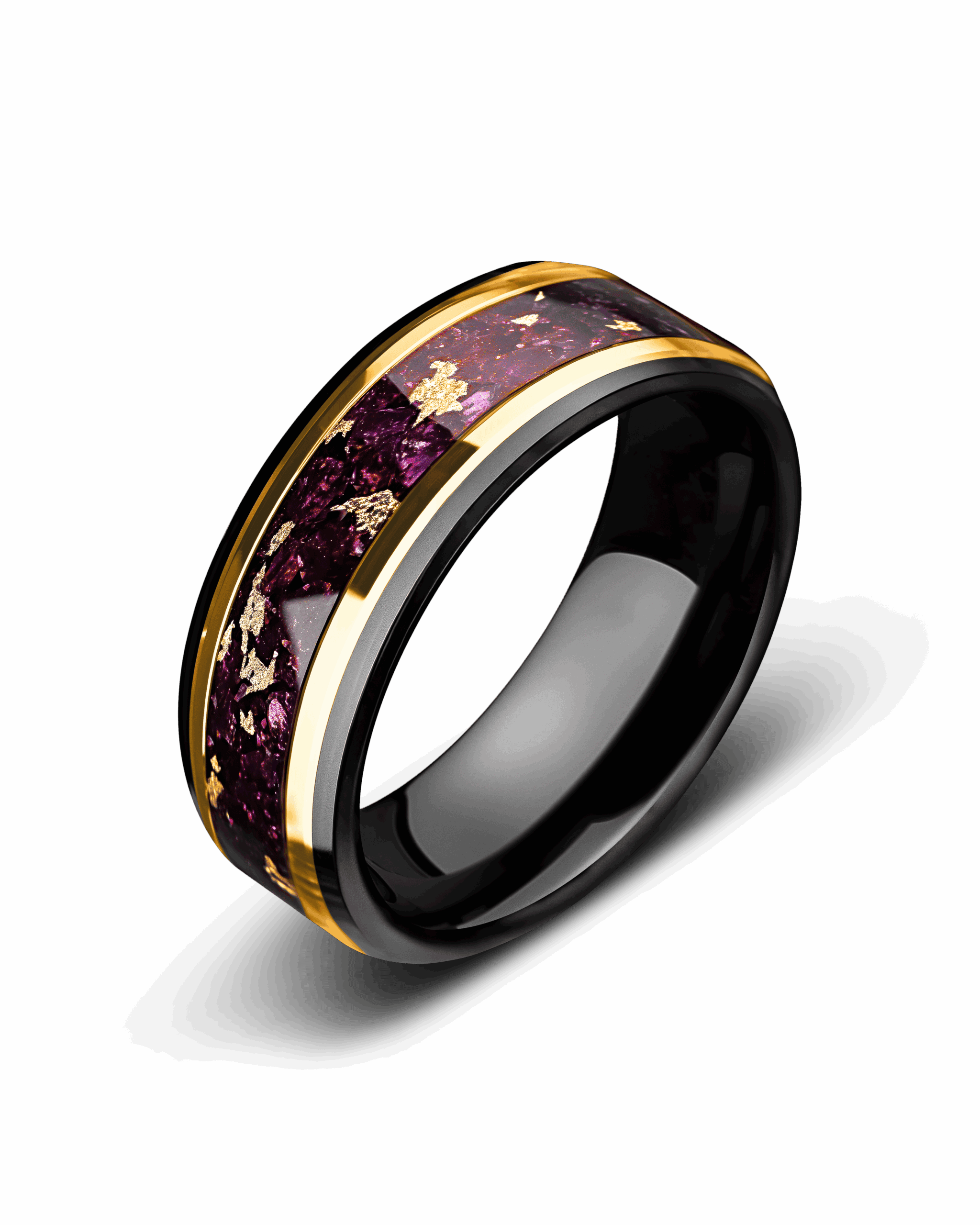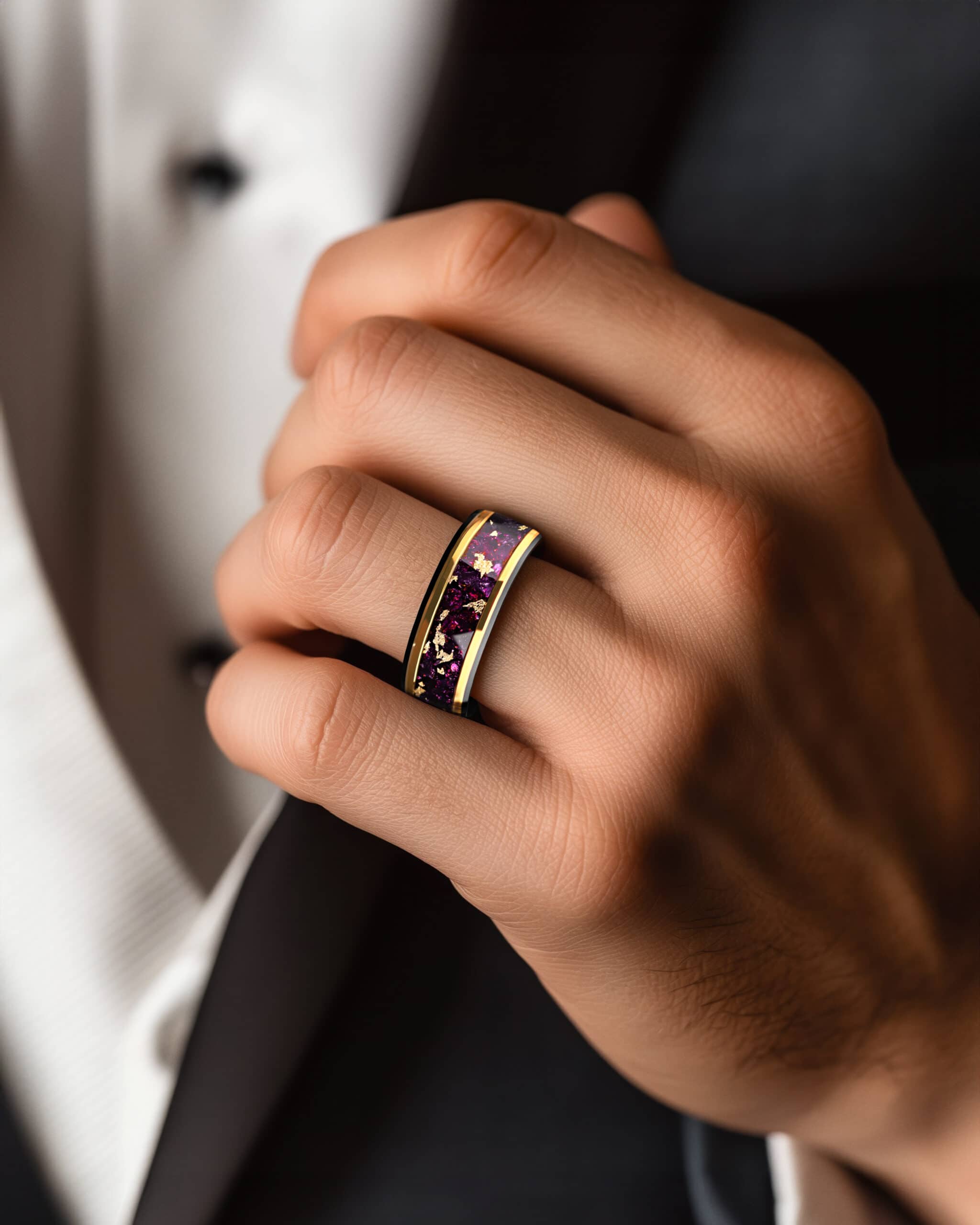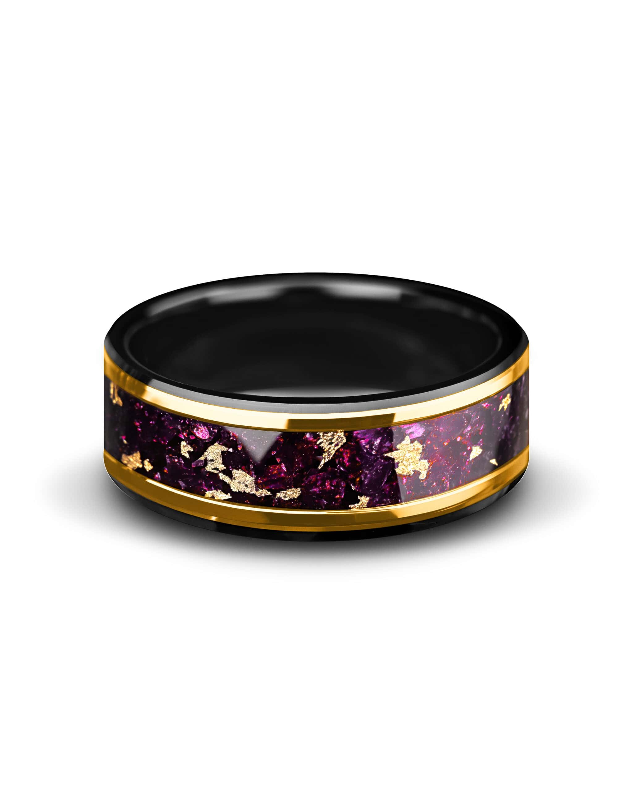 Prism reflects light and color in striking contrast. The black beveled tungsten edges create a bold frame, while the center glows with an inlay of crushed amethyst enriched with flecks of 18K gold leaf. Framed by radiant gold-plated lines, the design captures balance between dark resilience and luminous brilliance. Prism embodies transformation, clarity, and strength through refined elegance.