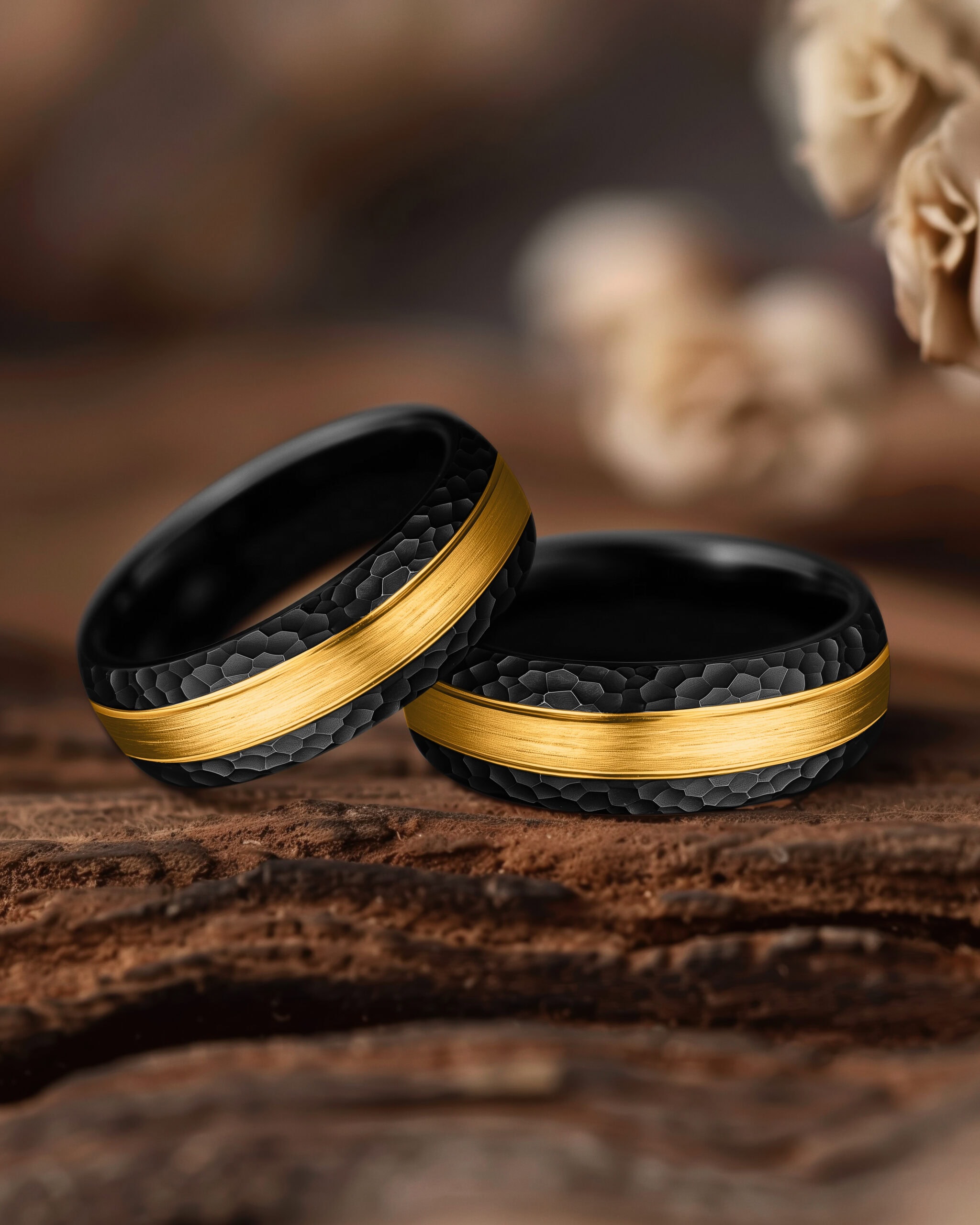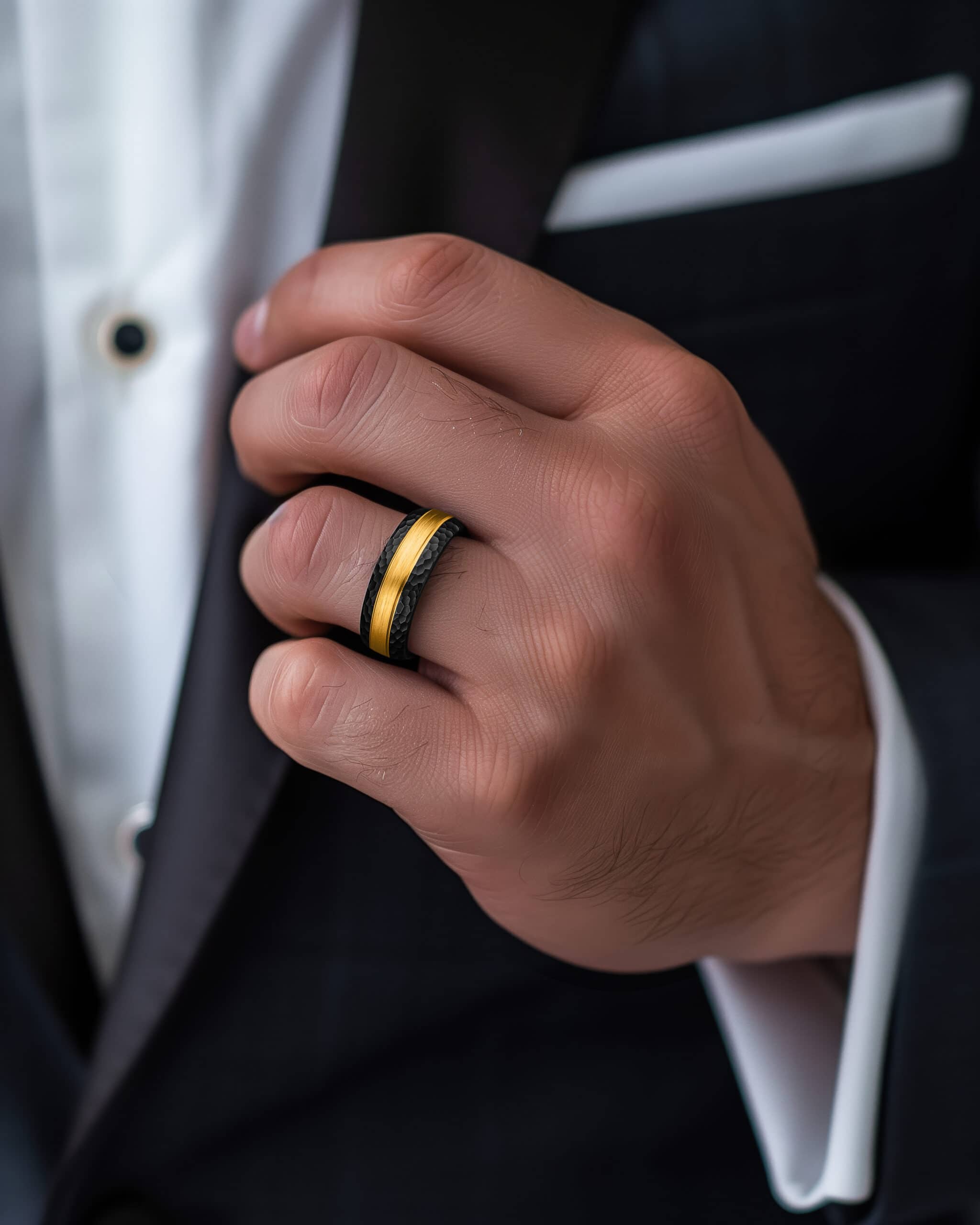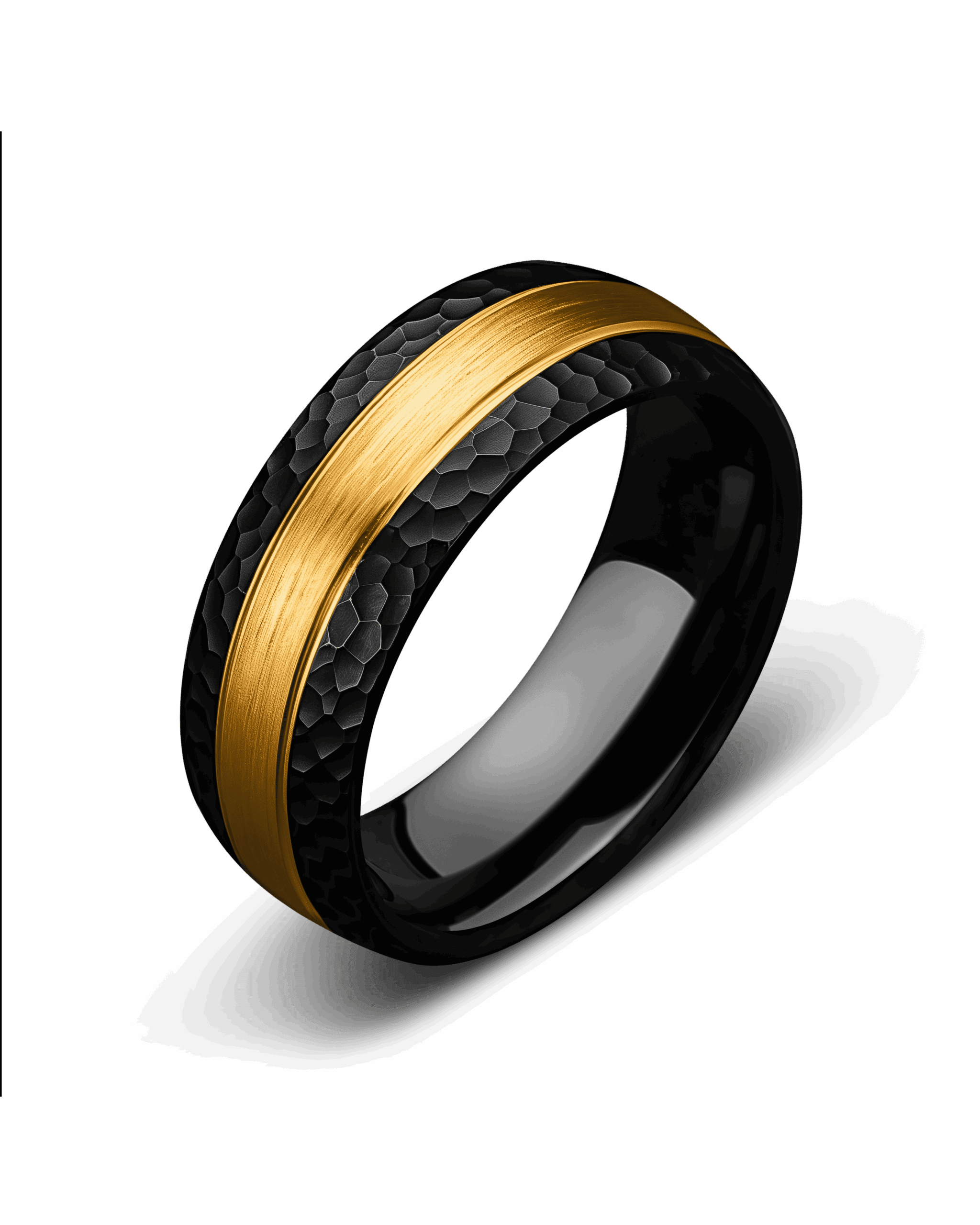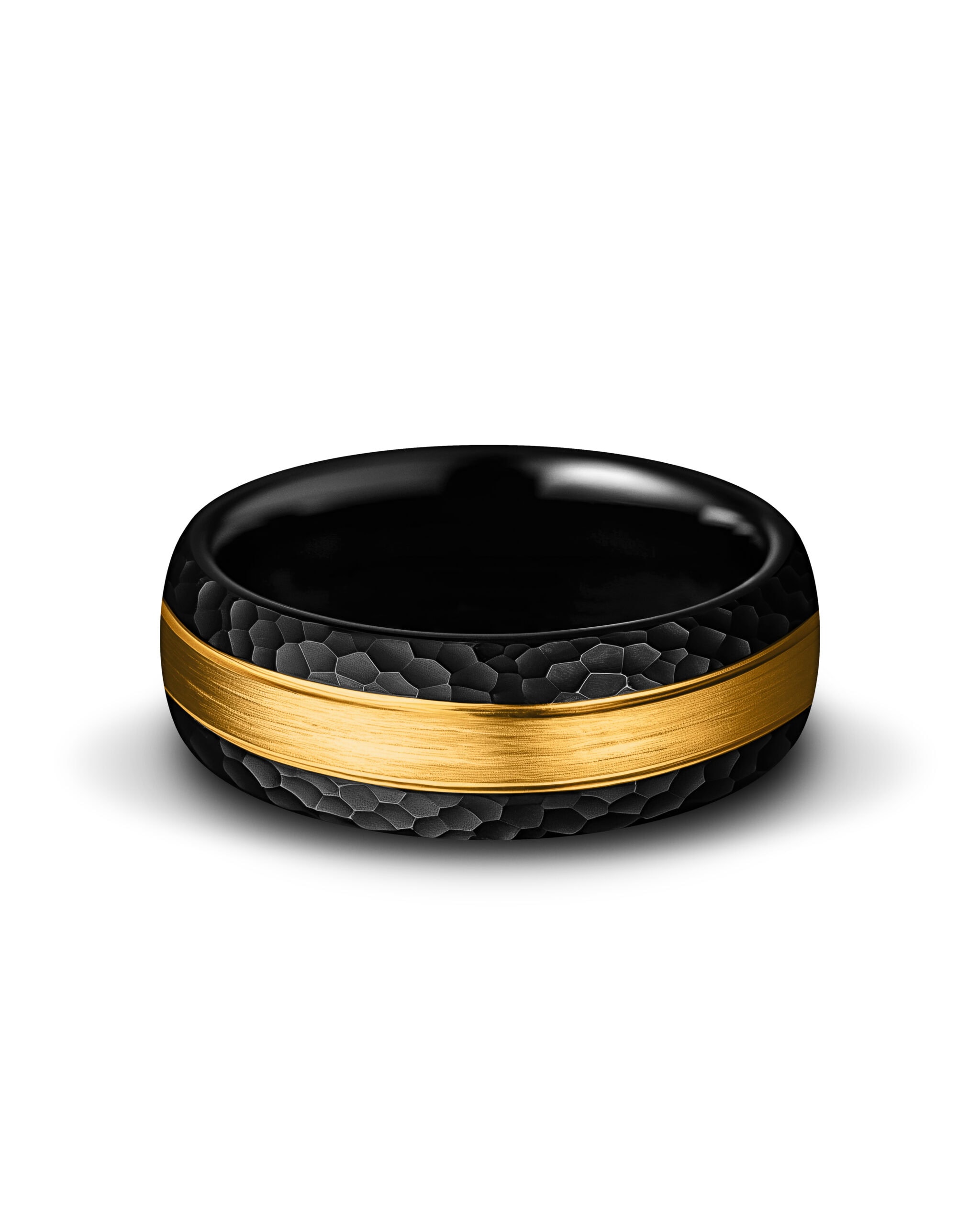 Aegis takes its name from the shield of the gods, a symbol of unwavering protection. The brushed gold center, flanked by polished gold lines, forms a striking core of strength. On either side, the hammered black tungsten edges add a rugged texture, evoking resilience forged under pressure. With its polished black interior, Aegis balances brilliance and durability—a guardian’s emblem for those who carry strength and honor into every vow.