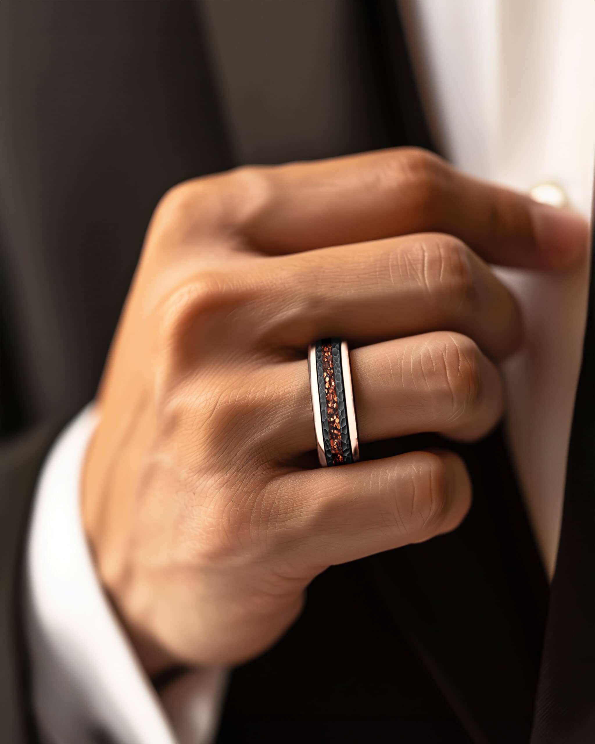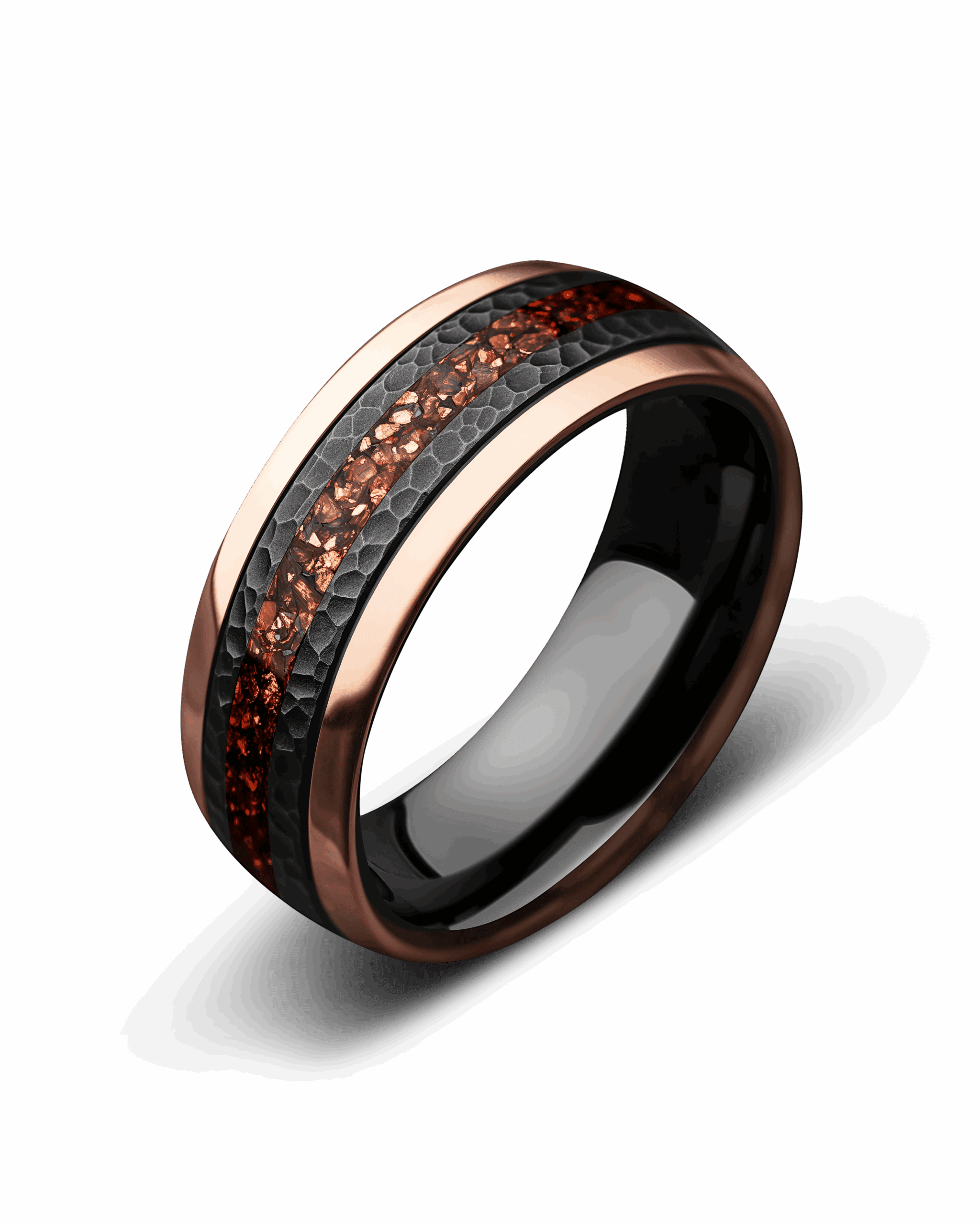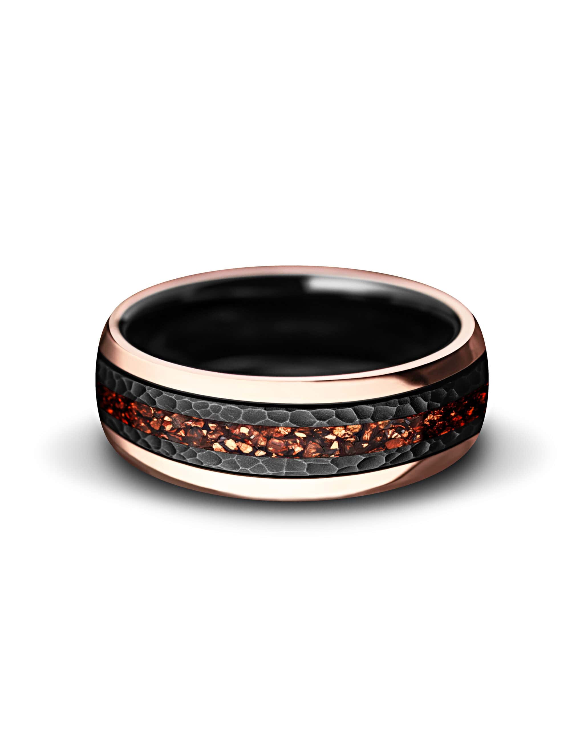 Draconis channels the untamed force of flame and shadow. Polished rose gold–plated edges gleam with warmth, contrasted by a sleek black interior. Through the center, a vivid inlay of crushed fire opal blazes with shifting flashes of red and gold, evoking the heart of a dragon’s fire. On either side, hammered black tungsten surfaces add rugged texture, grounding the design in strength. The result is a ring that embodies fierce energy, tempered by elegance.