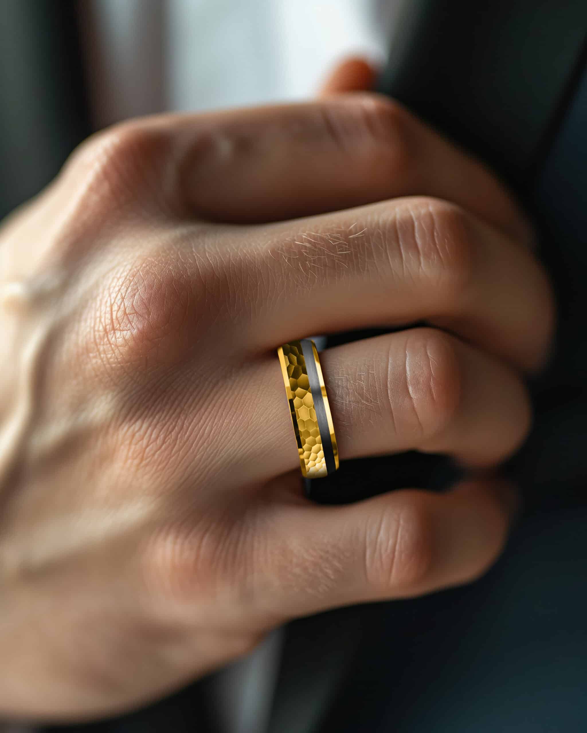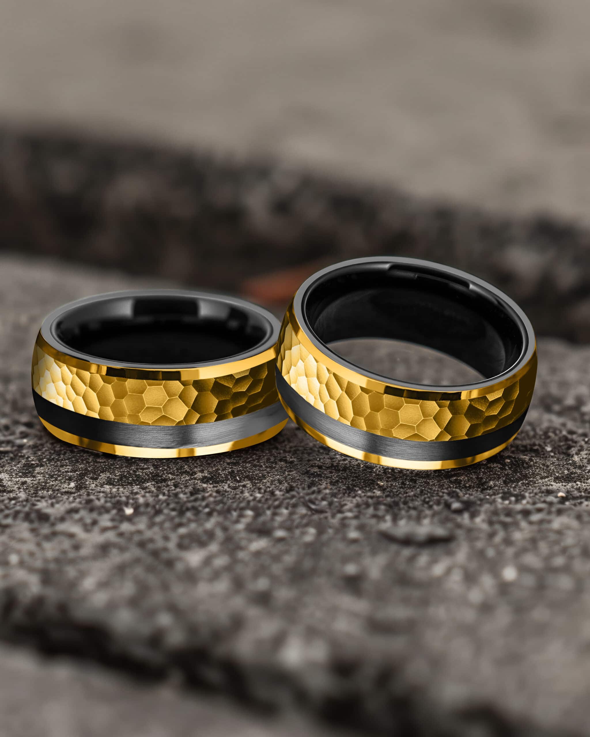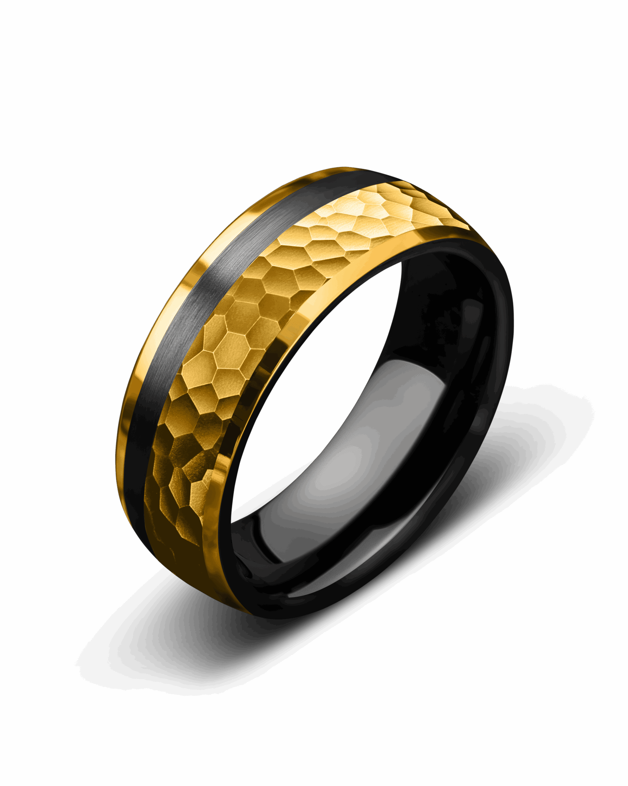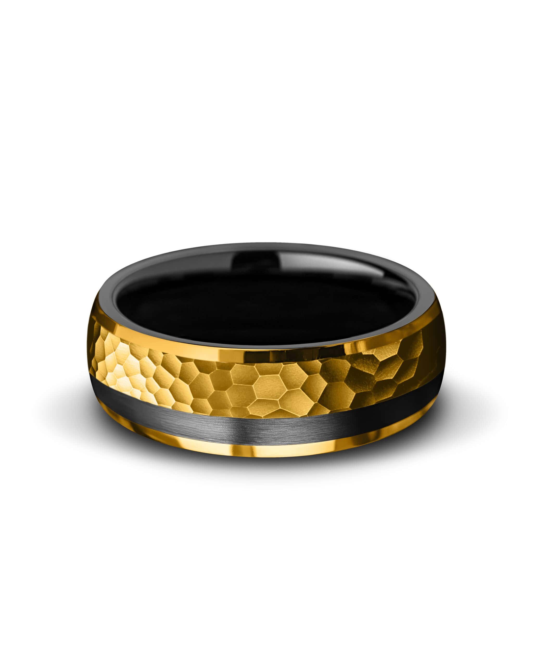 Electrum draws its name from the ancient alloy of gold and silver once treasured by kings. The band features a hammered, brushed gold surface that catches the light in striking patterns, offset by a bold strip of black that symbolizes balance and contrast. Polished gold edges frame the design with brilliance, while the deep black interior grounds it in strength. Electrum embodies heritage and resilience, a fusion of brilliance and shadow that honors timeless power.