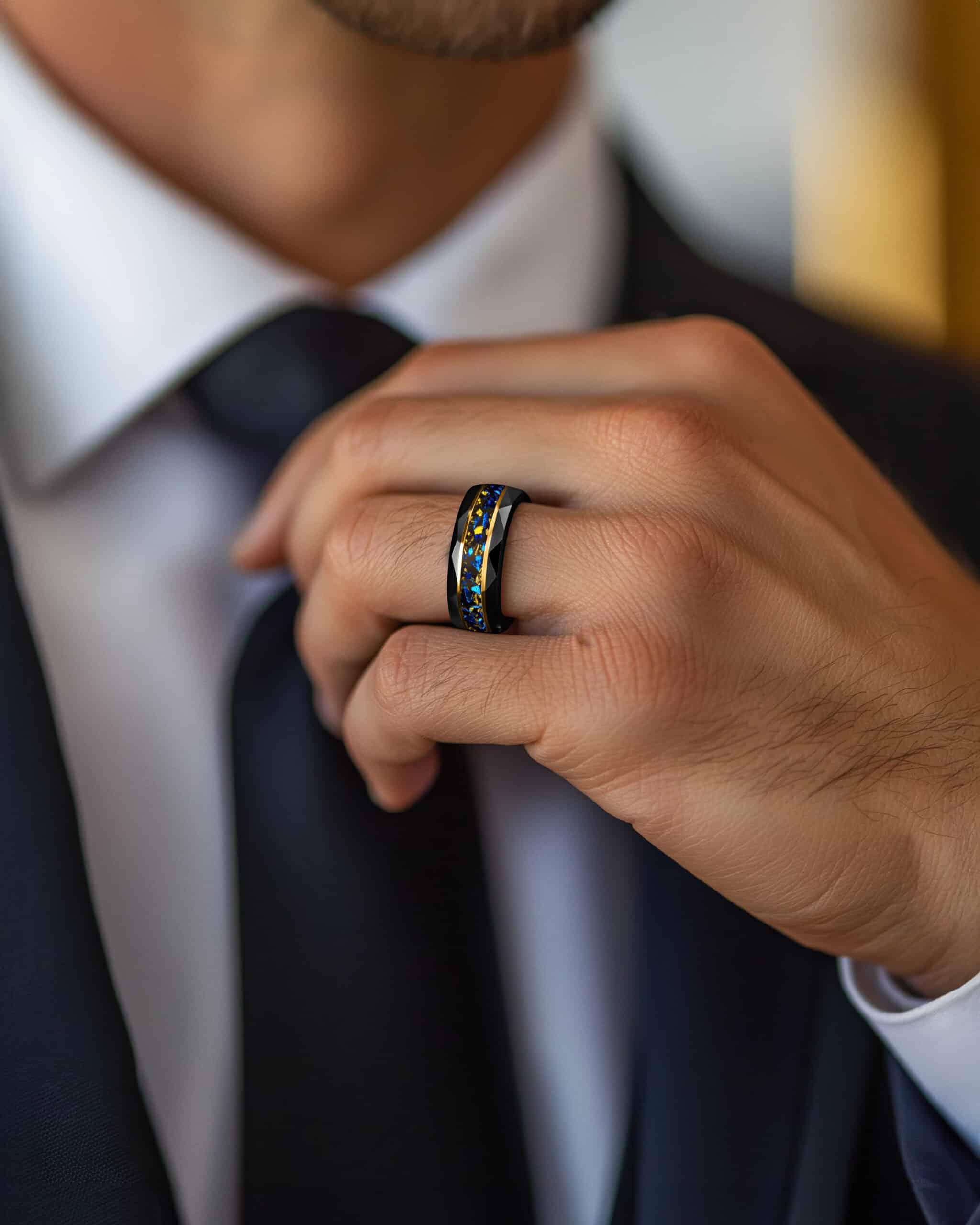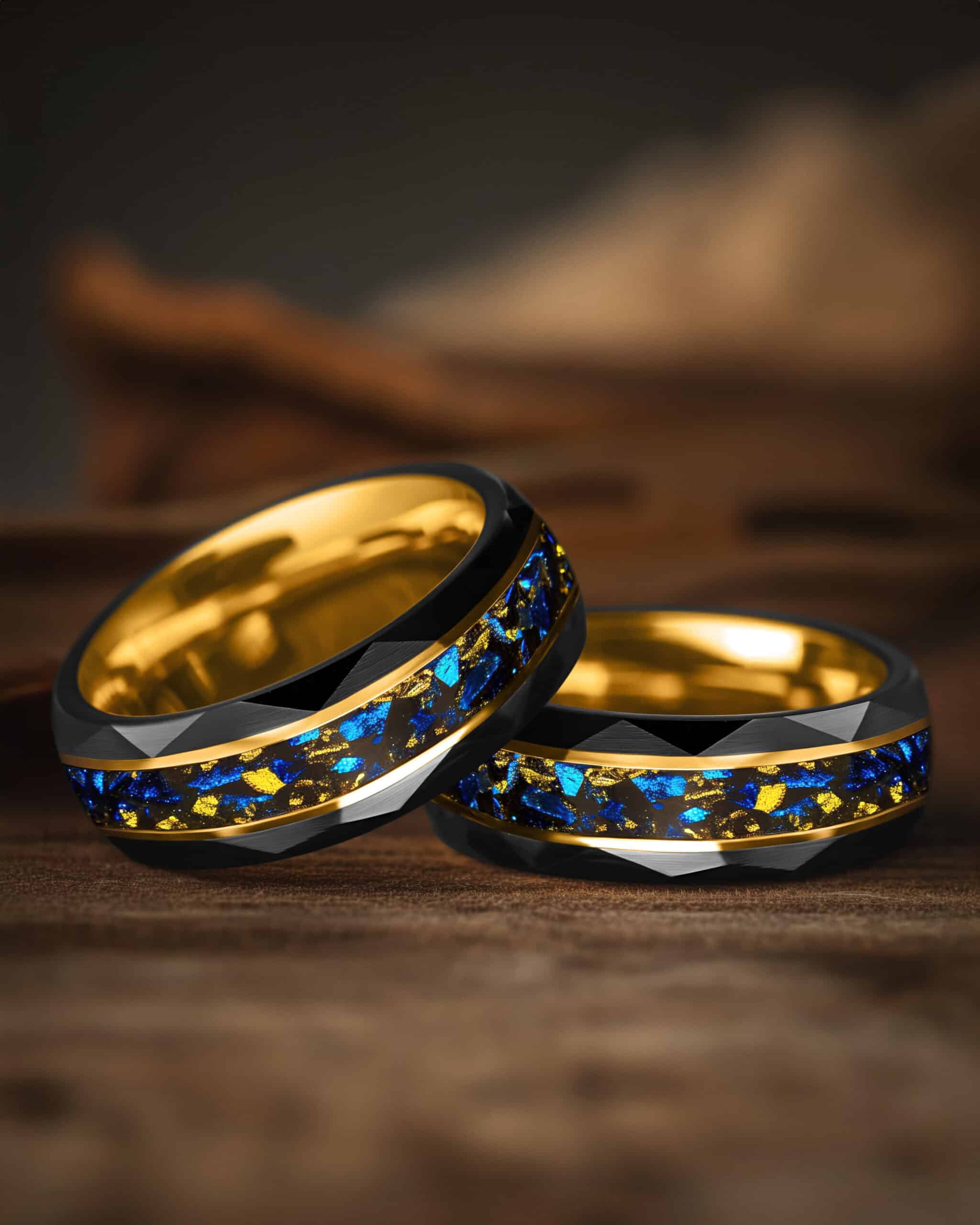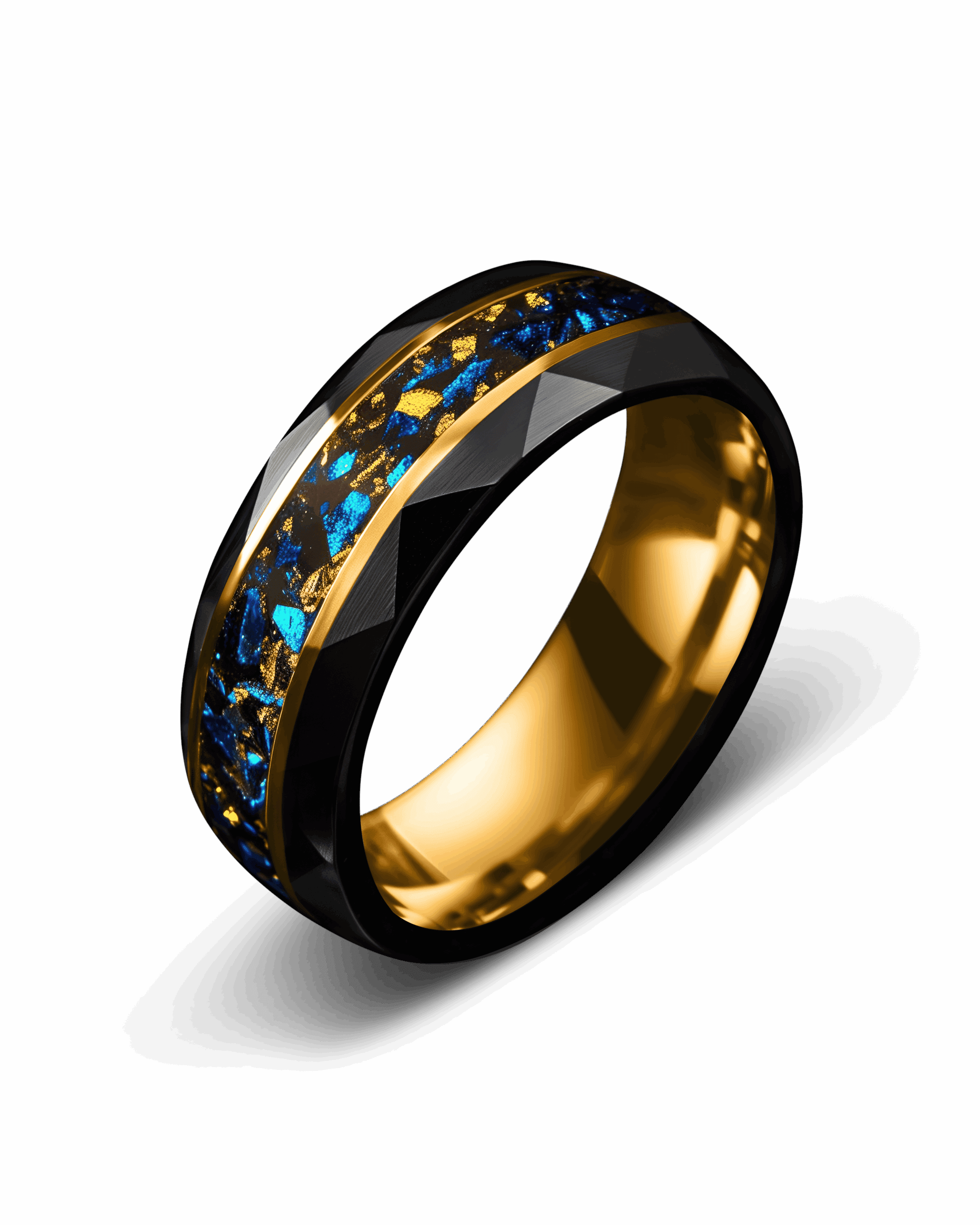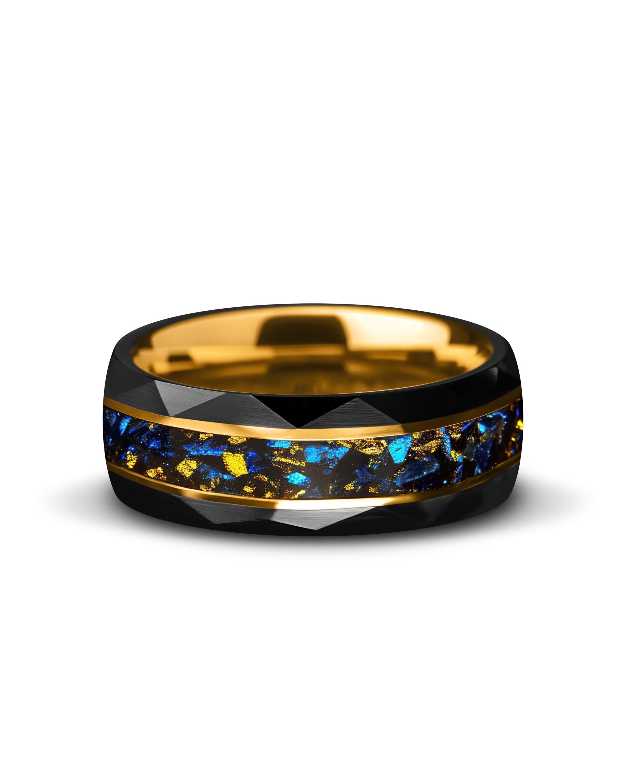 Equinox embodies balance between light and shadow. The faceted black brushed tungsten surface reflects strength with geometric precision, while its interior glows with a polished gold-plated finish. Through the center runs an inlay of crushed blue sandstone, shimmering like fragments of night sky, enriched by flecks of 18K gold leaf that glisten like stars. Framed by twin gold-plated lines, the design unites resilience with cosmic brilliance—where darkness meets radiance in perfect harmony.