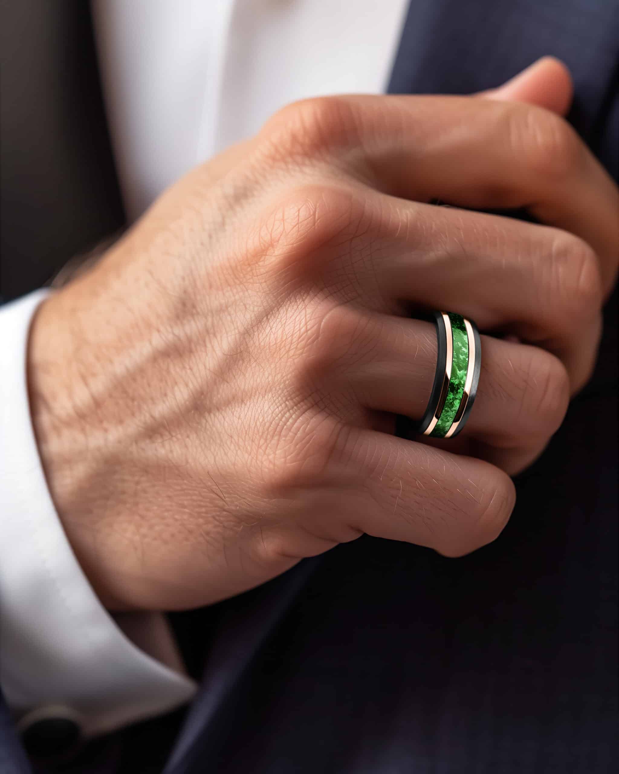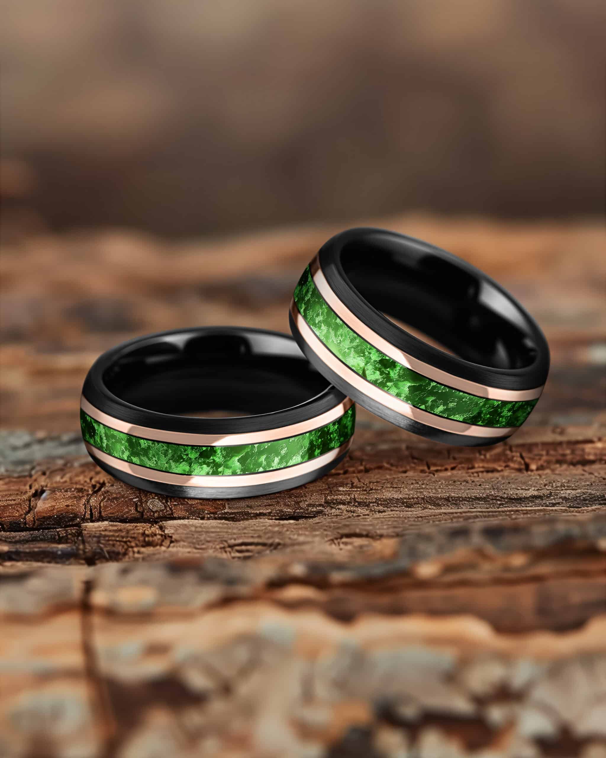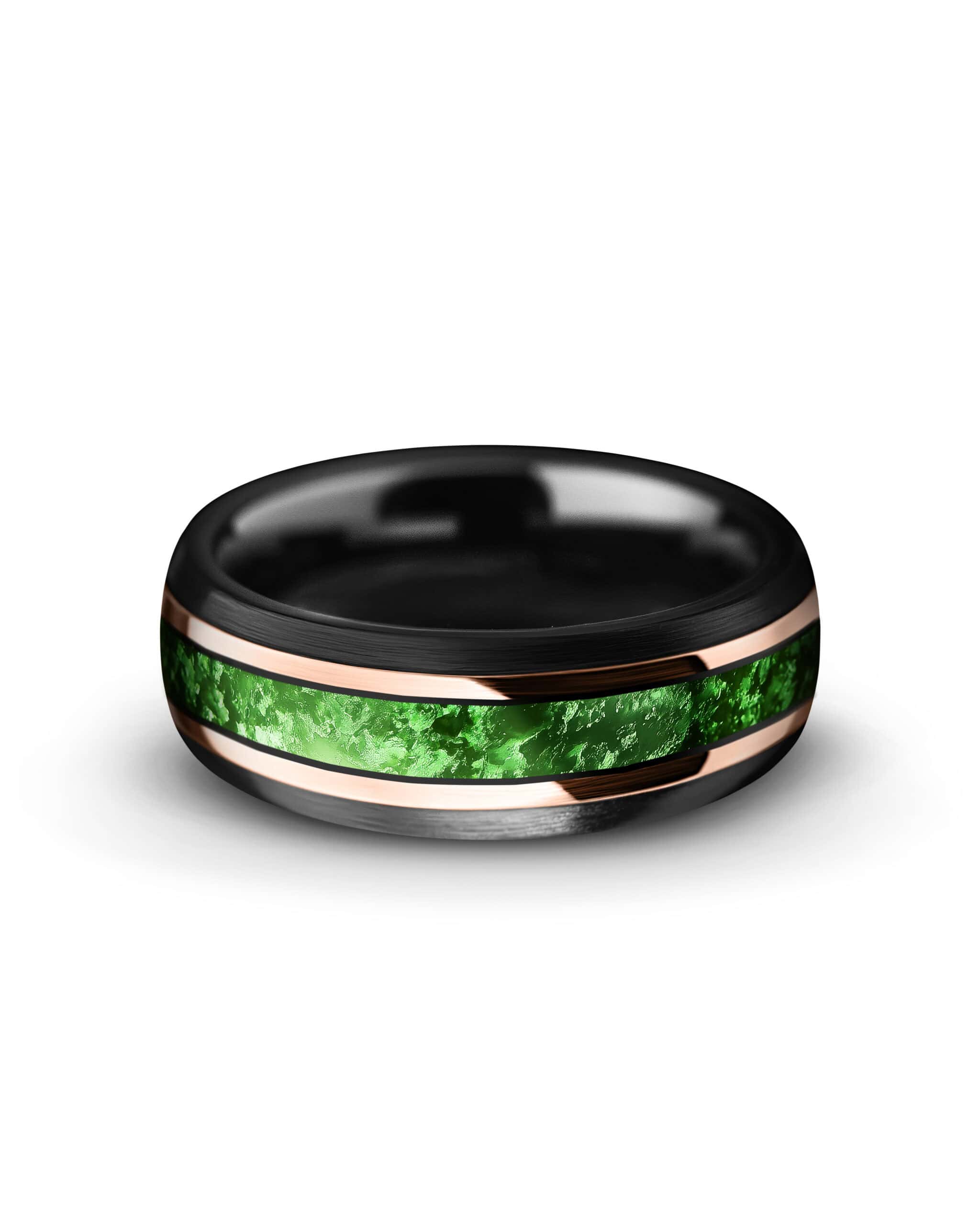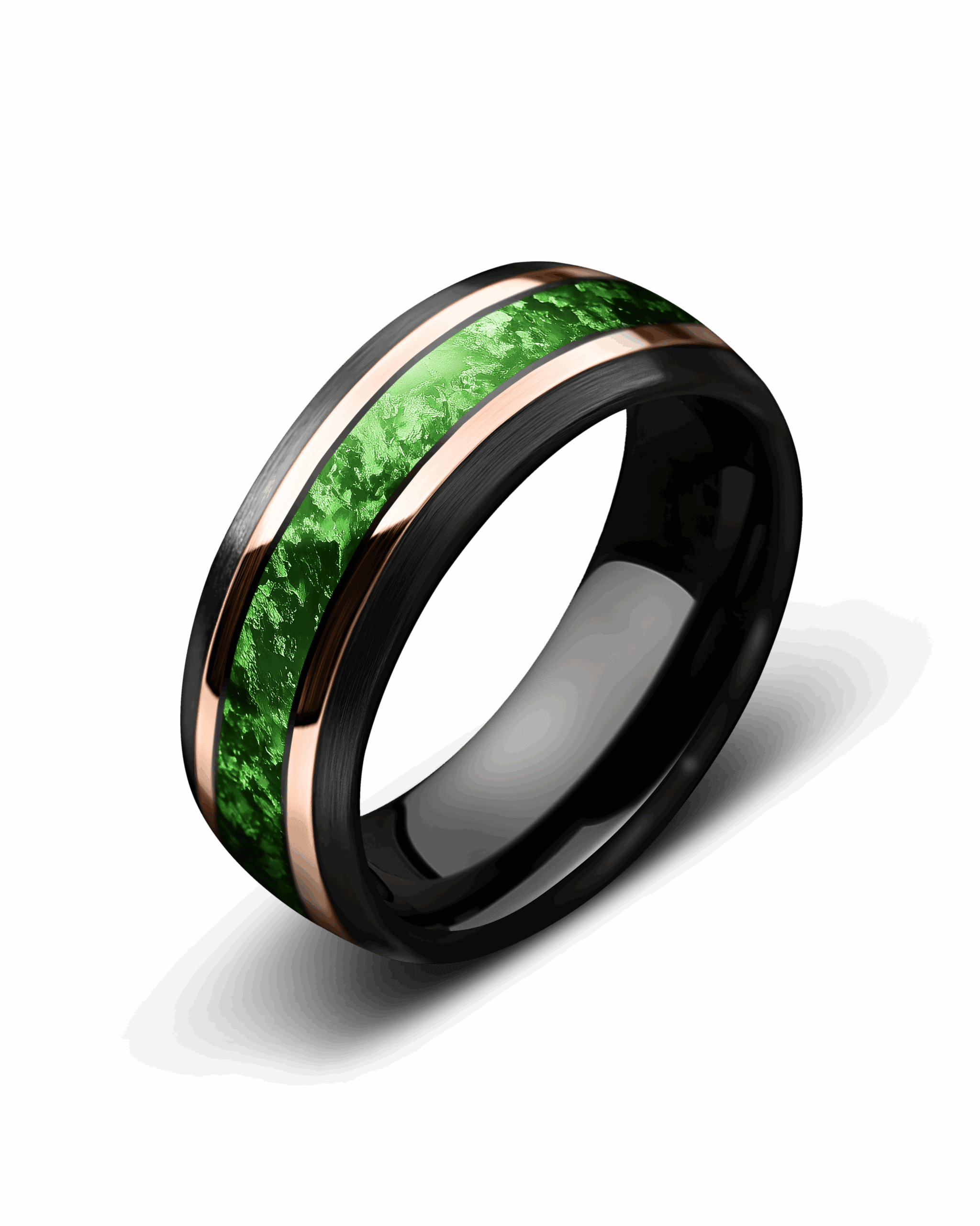 Evergreen brings the vitality of nature into a sleek, modern form. The brushed black tungsten surface provides a bold foundation, contrasted by a luminous inlay of green moss agate, alive with organic texture and depth. Framed by twin rose gold–plated lines, the design balances earthy richness with refined warmth—an enduring symbol of growth and resilience.
