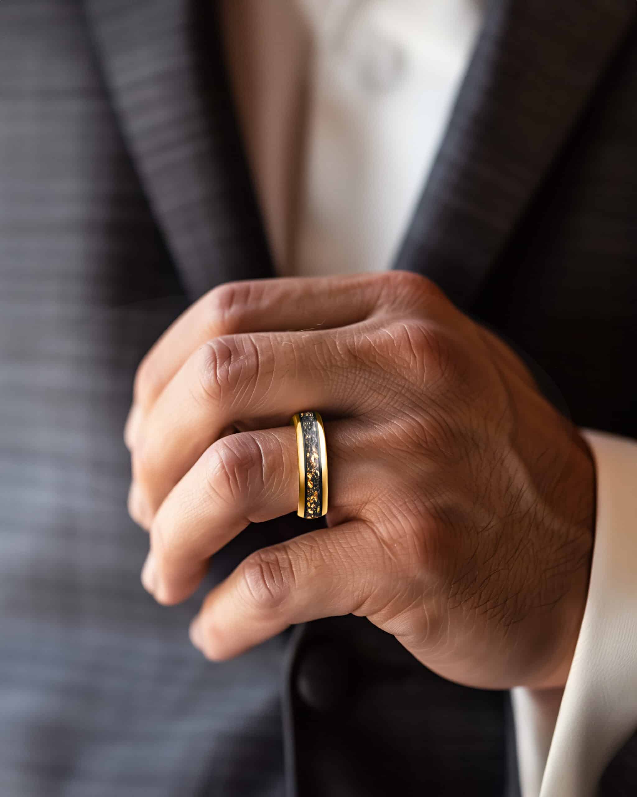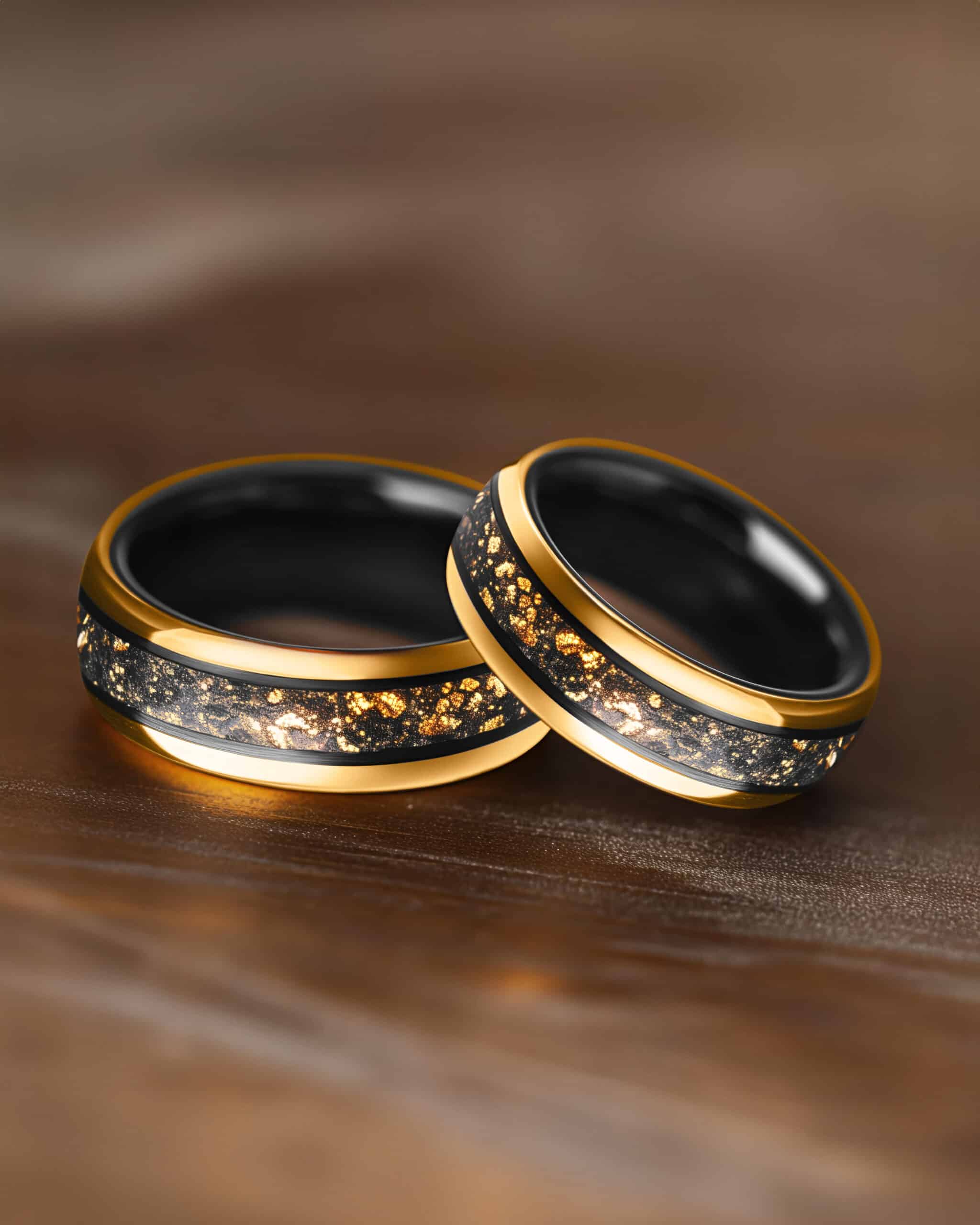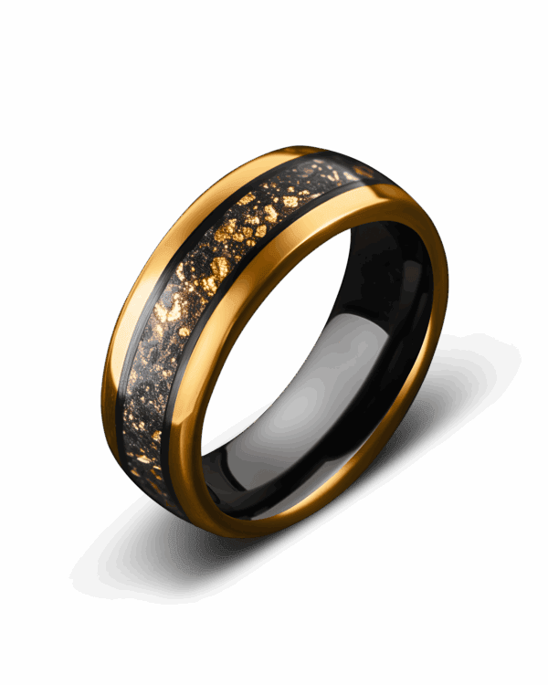 Golden Meteor captures cosmic brilliance forged in strength. The polished 18K gold–plated tungsten exterior glows with radiant light, contrasted by a sleek black interior. Across the surface, an inlay of genuine meteorite mixed with flecks of 18K gold leaf evokes fragments of the cosmos, shimmering with otherworldly texture. Framed by dual black lines, the design balances celestial wonder with modern edge—an homage to fire and starlight bound in metal.