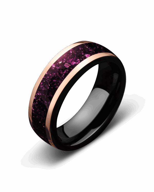Obsidian Rose unites warmth and mystery in a striking composition. The polished rose gold–plated tungsten exterior glows with refined elegance, contrasted by a deep black interior that adds depth and balance. At the center, an inlay of crushed amethyst shimmers with violet tones, its natural radiance standing out against the warmth of rose gold. The design reflects harmony between strength, luxury, and the quiet power of stone.