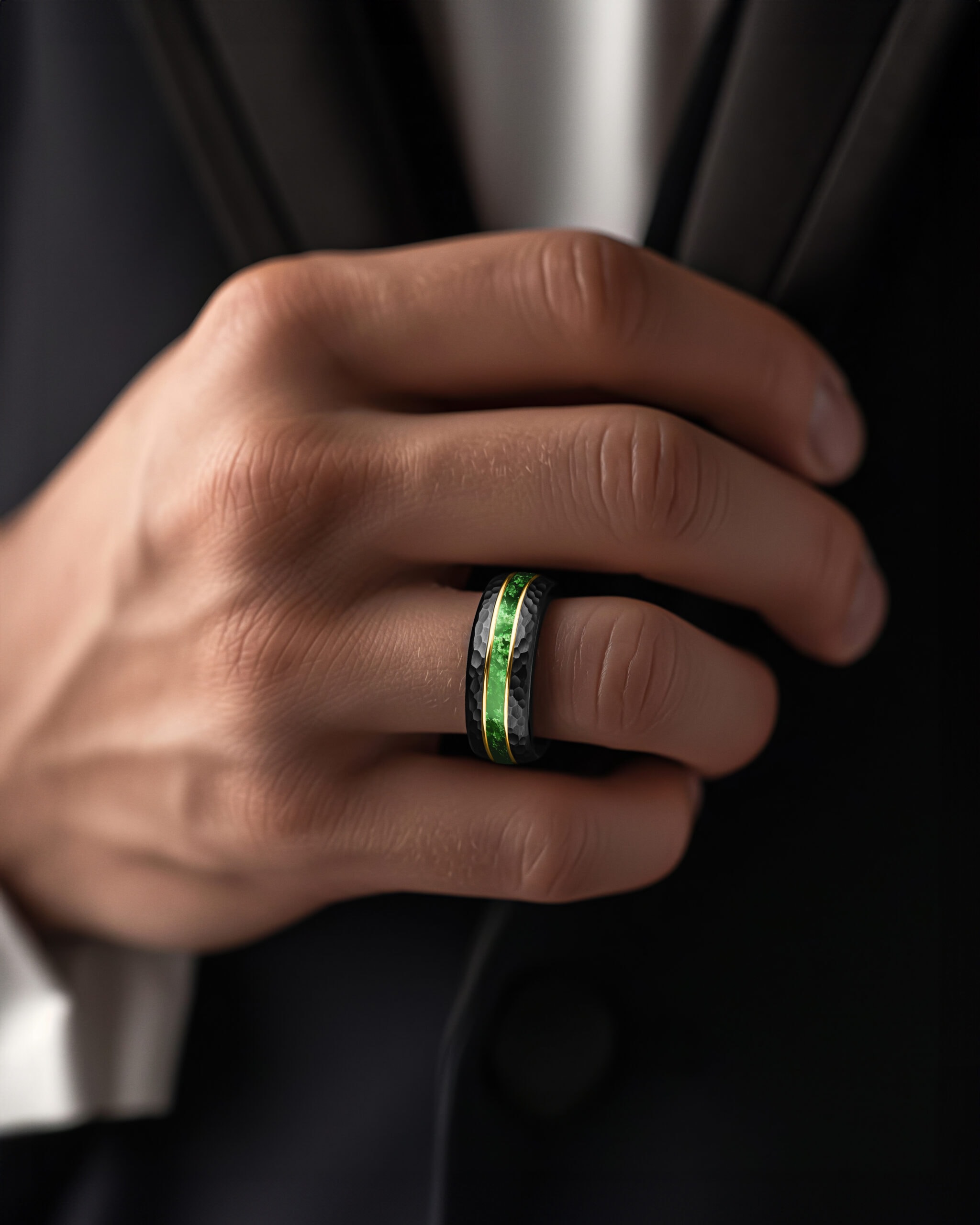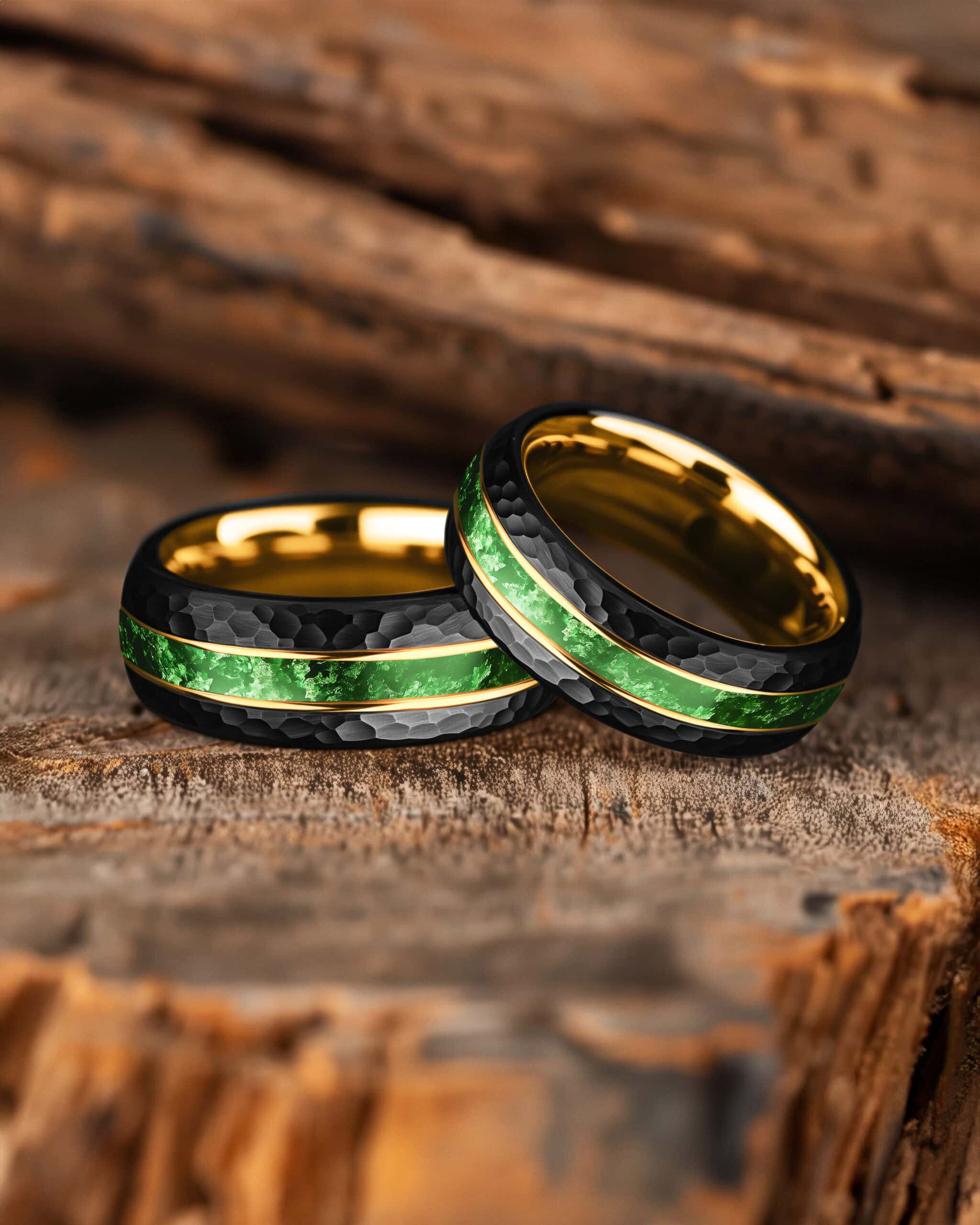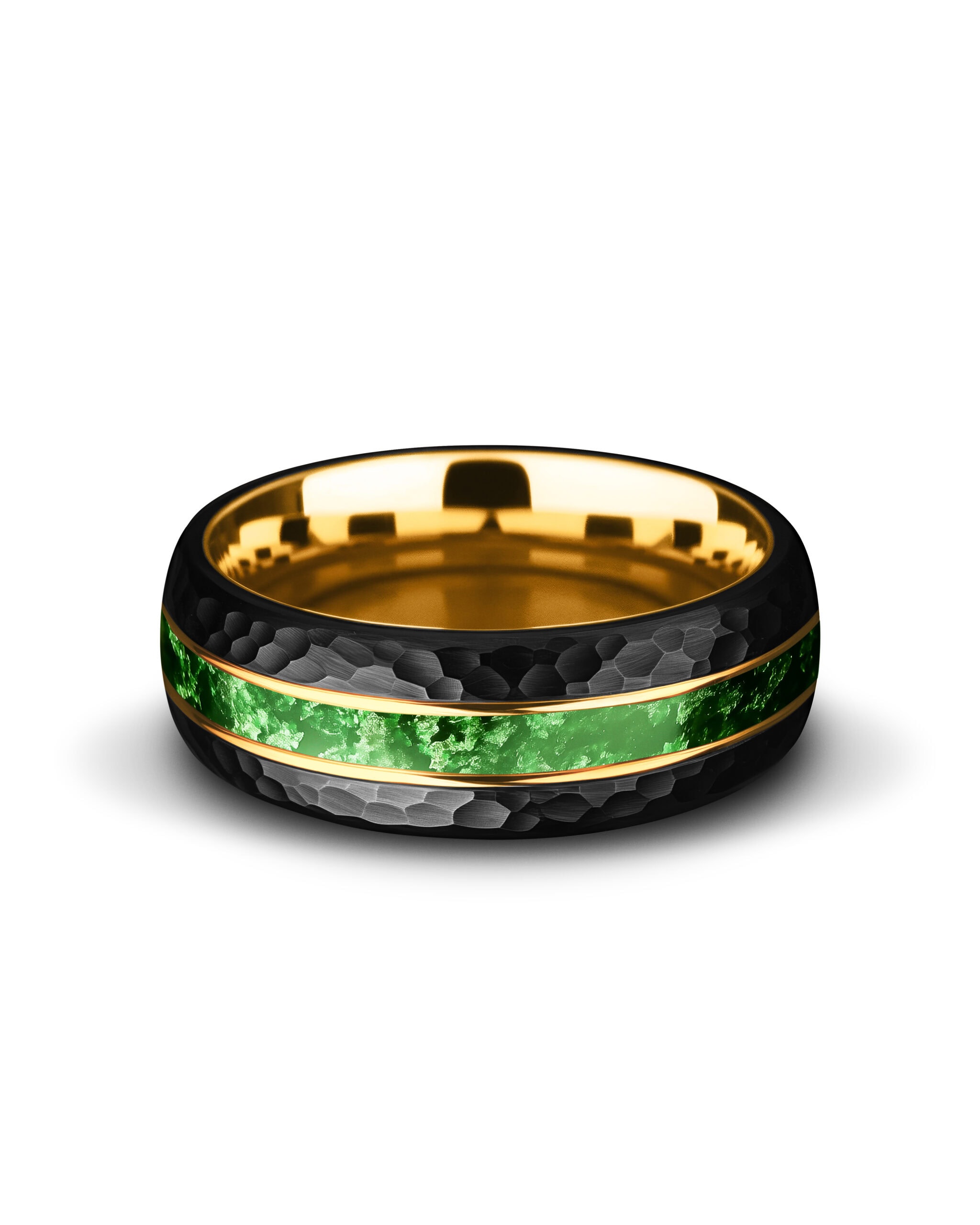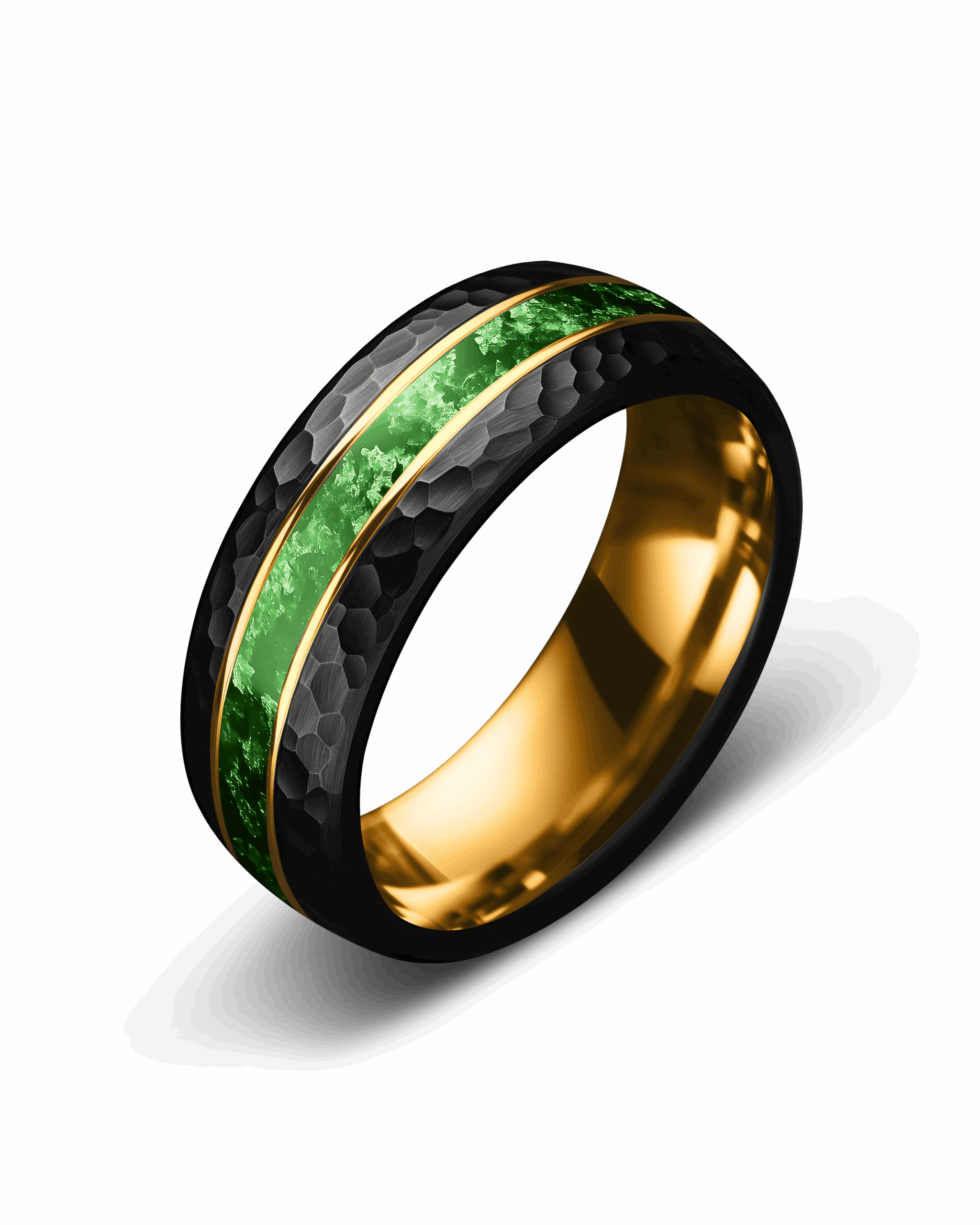 Pathfinder embodies resilience rooted in nature. The hammered black tungsten surface gives the band a rugged, tactile character, while its interior glows with a radiant gold-plated finish. Through the center, an inlay of green moss agate reveals organic textures and earthy depth, framed by twin 18K gold–plated lines for contrast. The design blends raw strength with natural vitality—enduring, balanced, and alive with color.