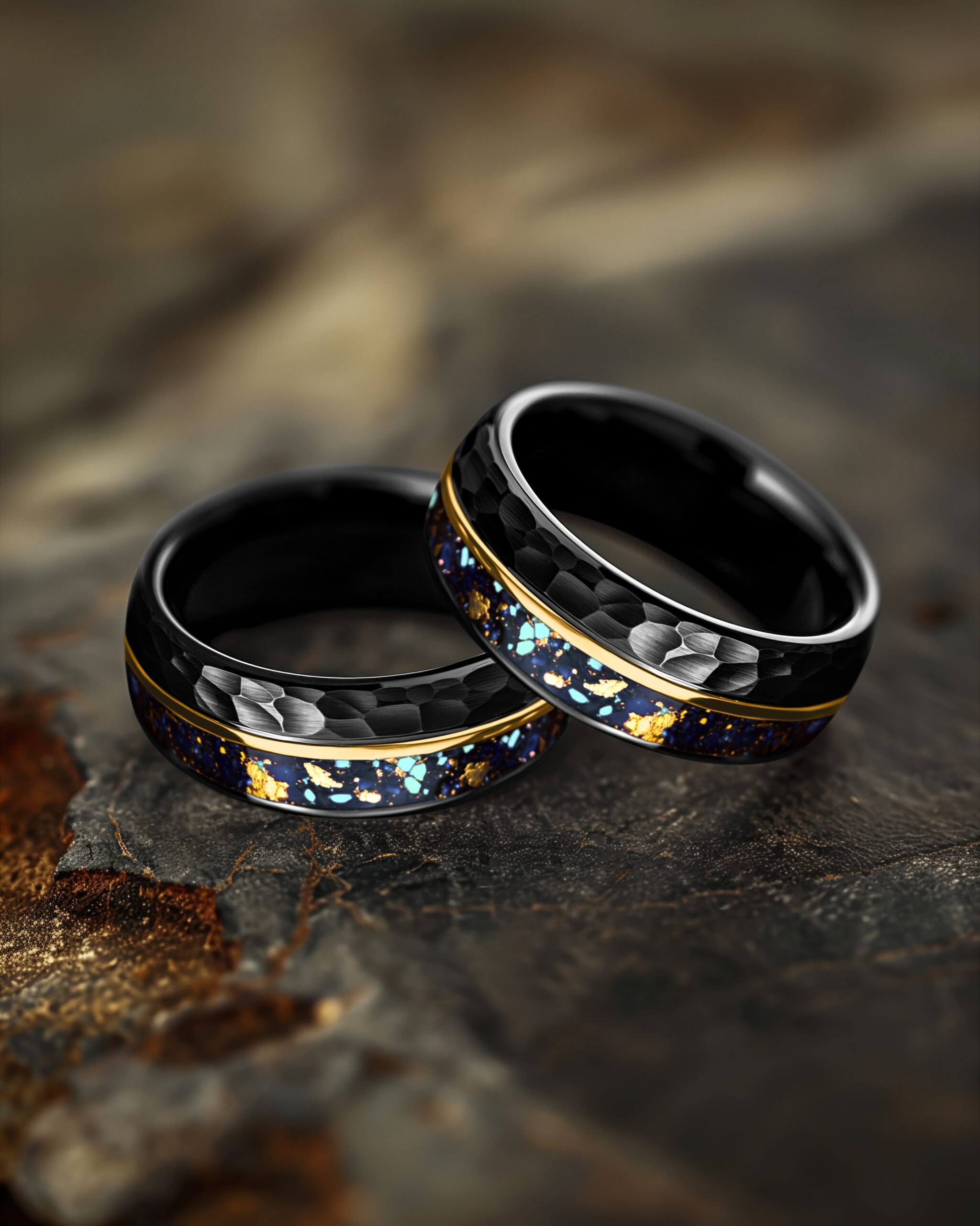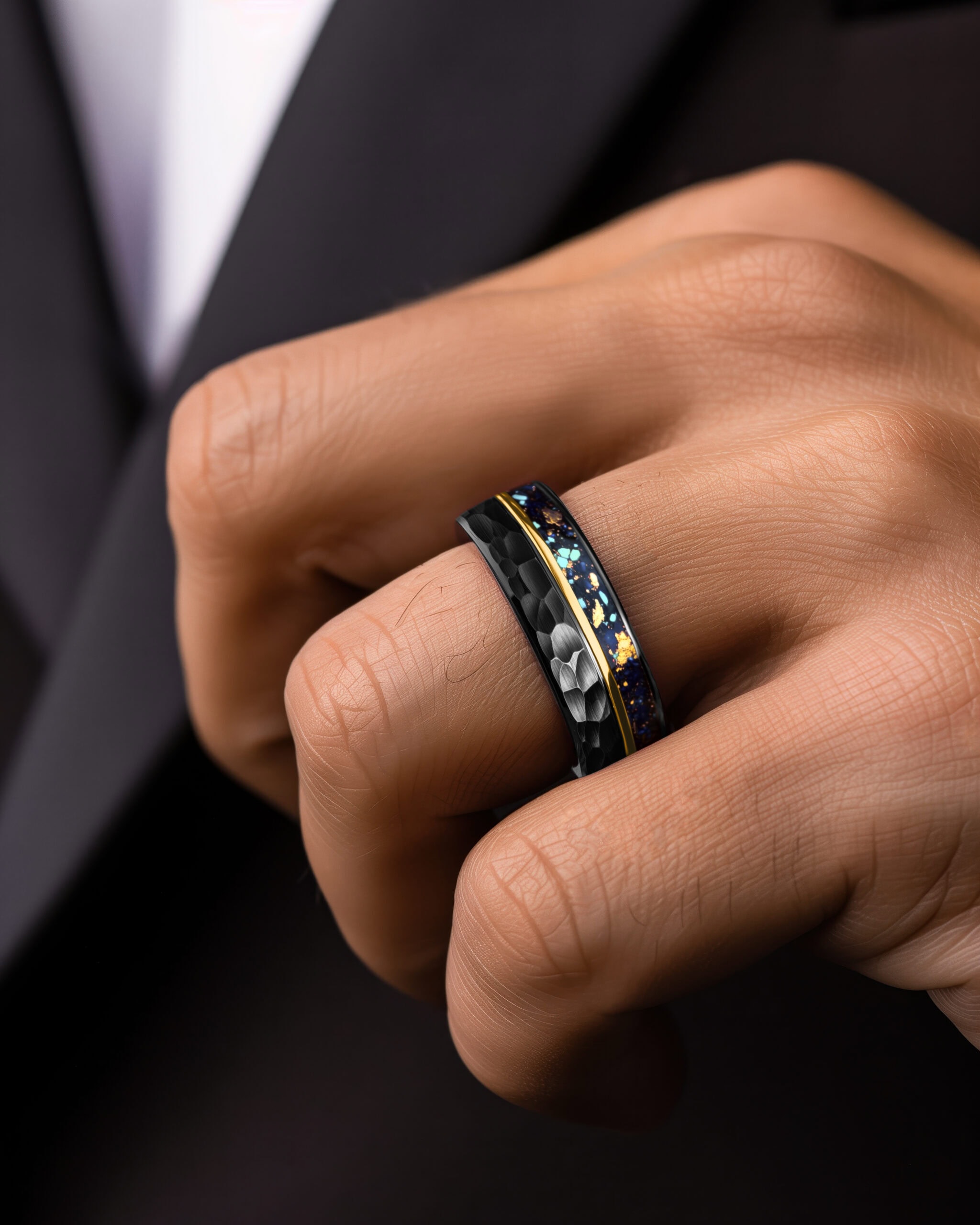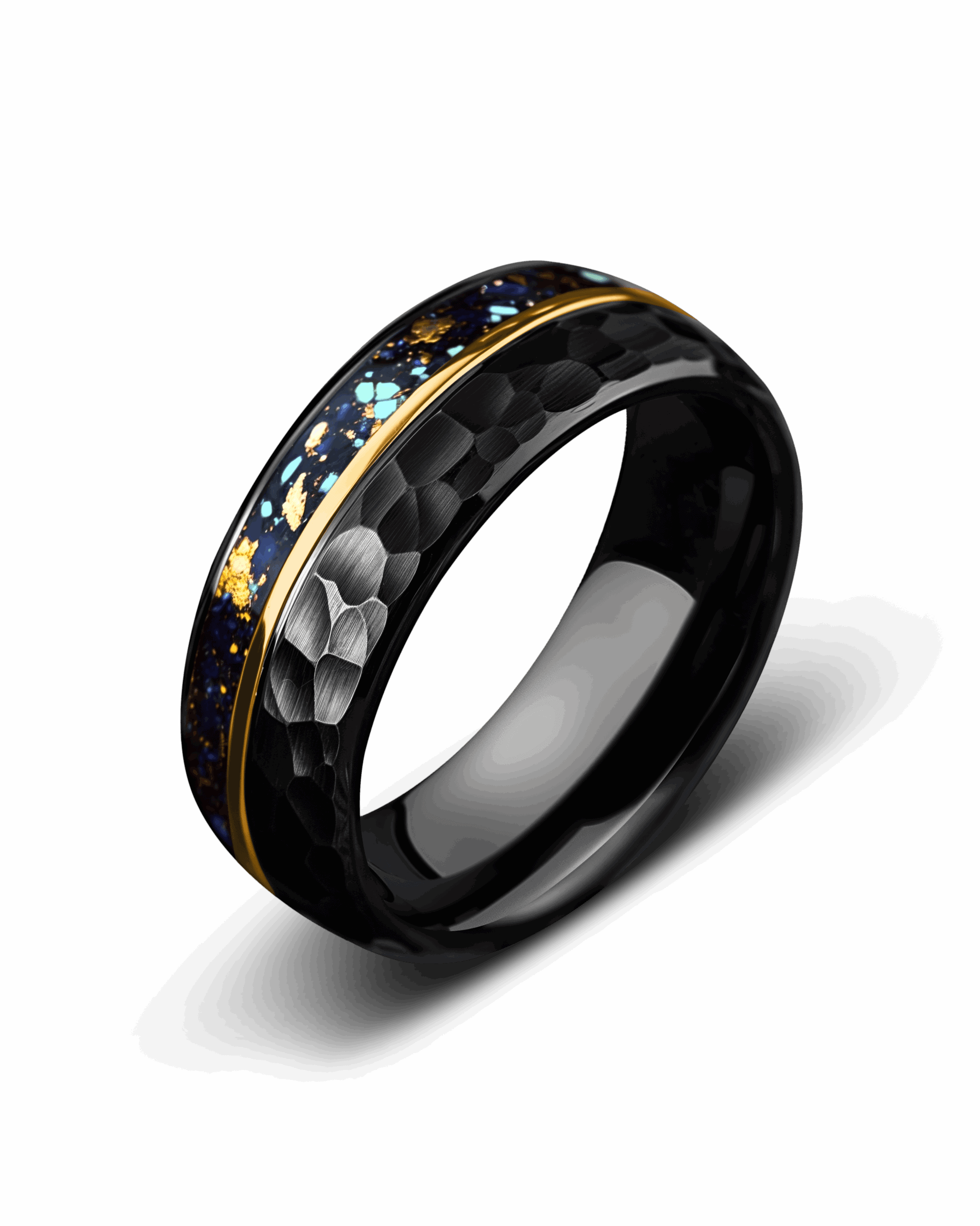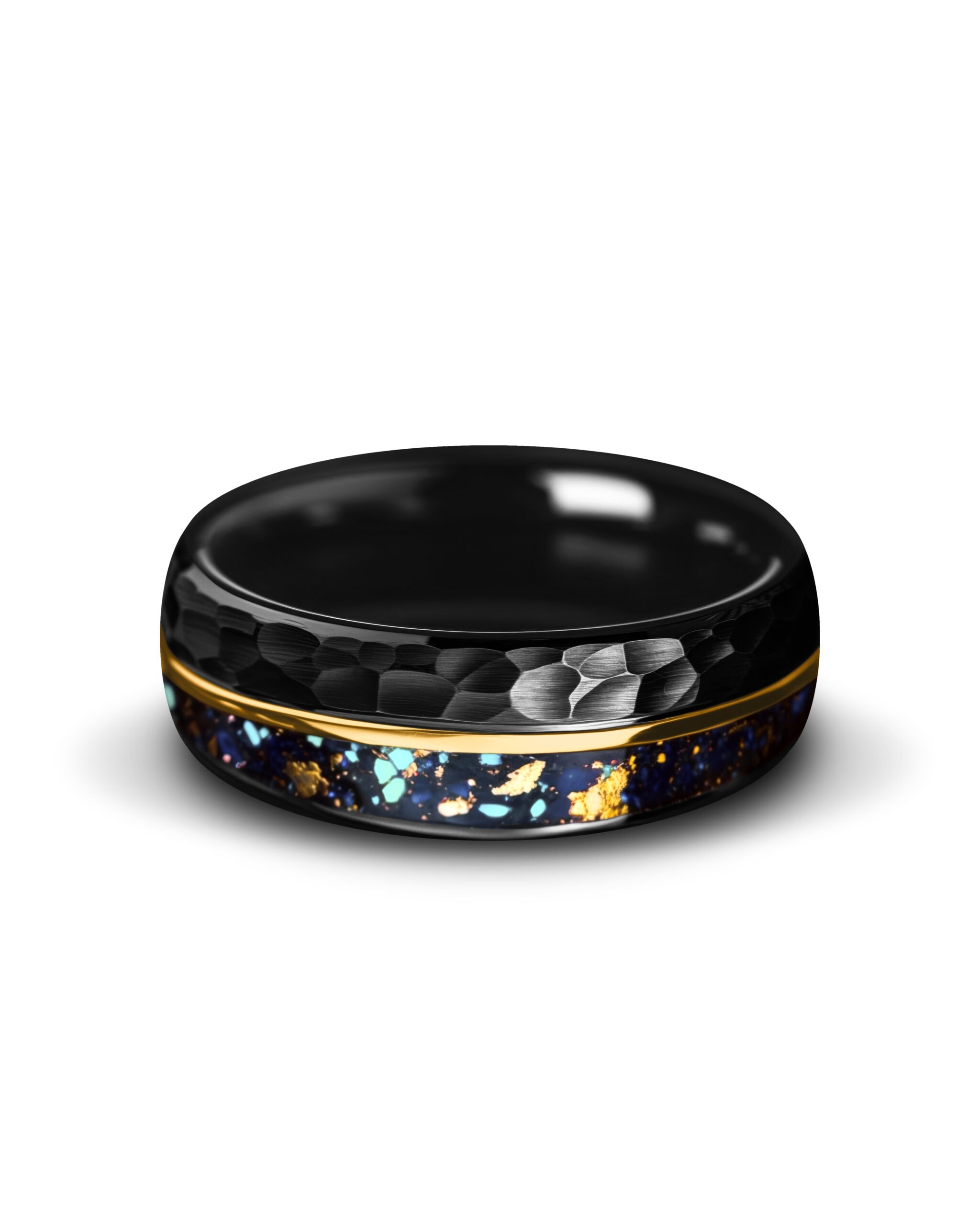 Riptide flows with motion and contrast. The all-black hammered tungsten surface carries a rugged, tactile texture, while a polished 18K gold-plated center line cuts cleanly through the band. Alongside it, an offset inlay of crushed turquoise opal shimmers with shifting blues, enriched by flecks of 18K gold leaf that glisten like sunlight on water. The design captures the power and rhythm of waves—strength forged in darkness, highlighted by luminous detail.