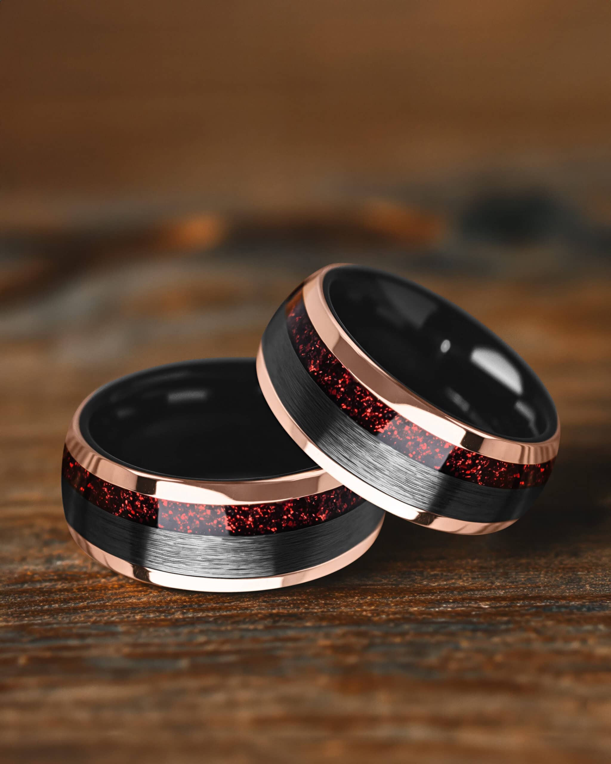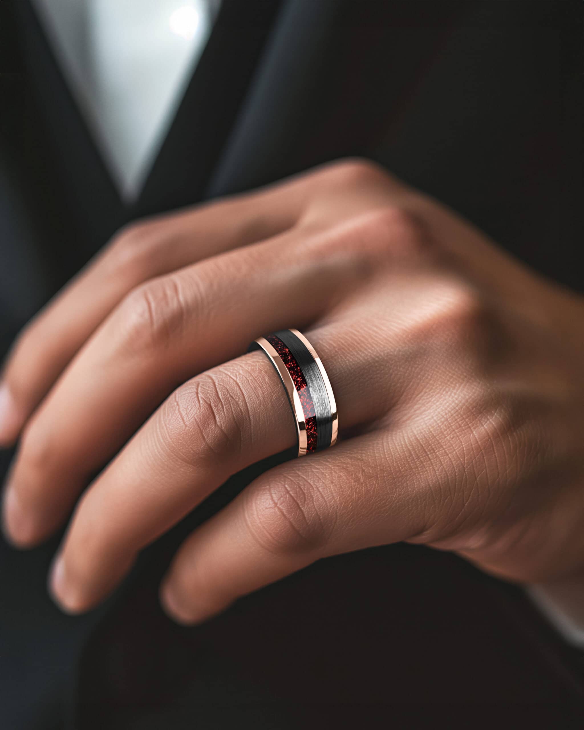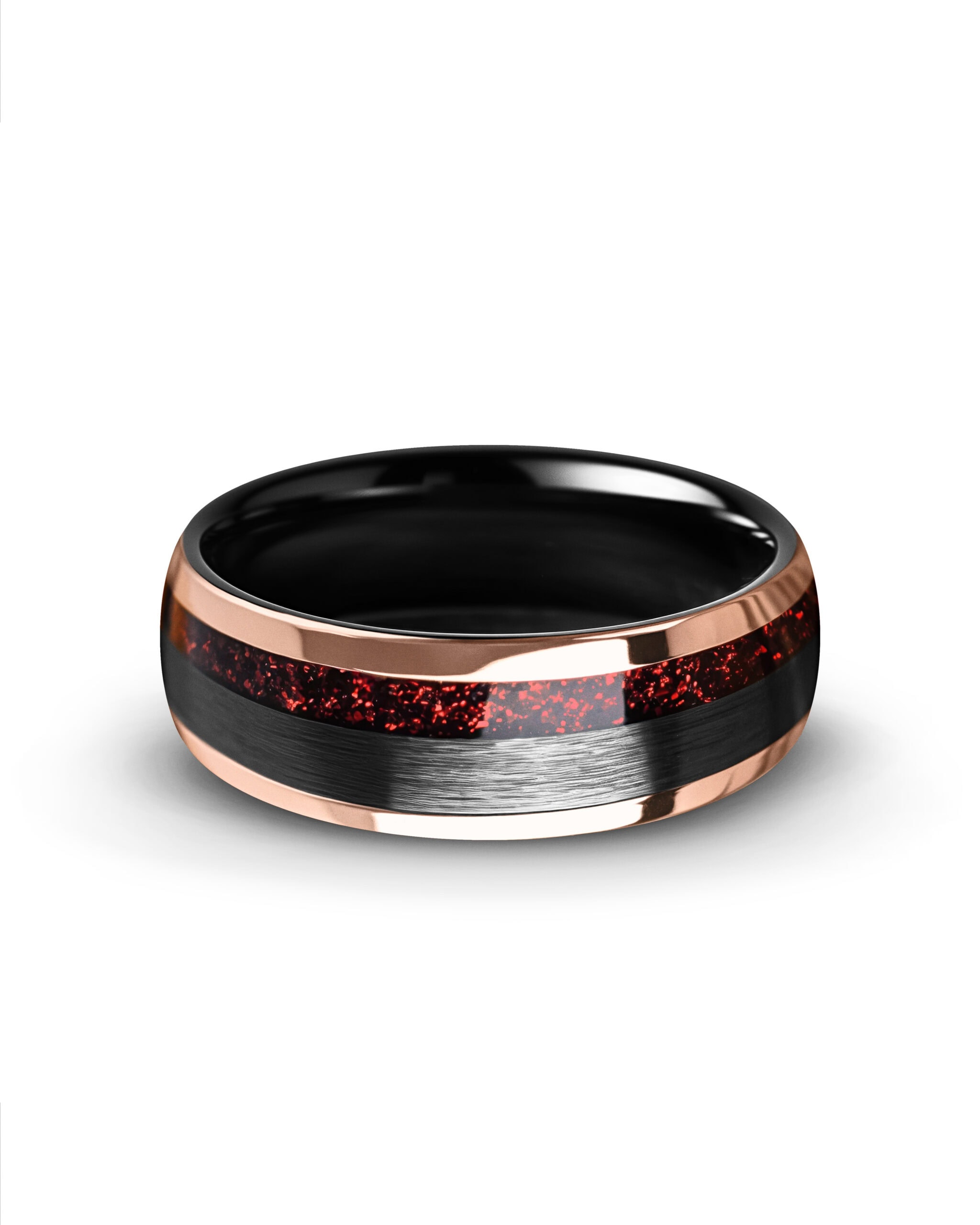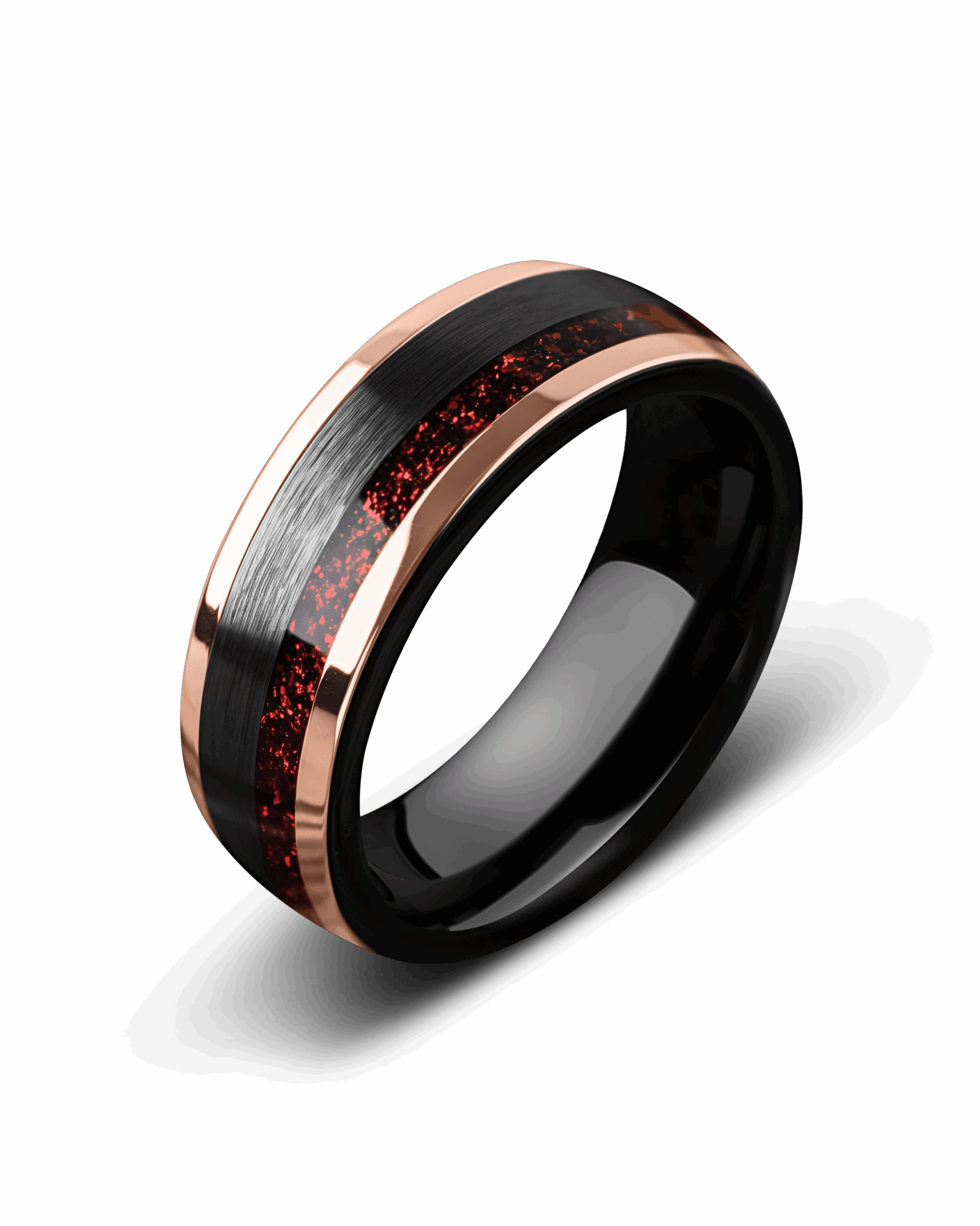 Rosefire blends warmth and intensity in a striking design. The brushed black tungsten surface sets a bold foundation, edged with polished rose gold–plated borders that shine with refined contrast. An offset inlay of crushed ruby runs through the band, glowing with fiery red sparkles that shift in the light. Finished with a sleek black interior, the ring balances modern strength with passionate brilliance.
