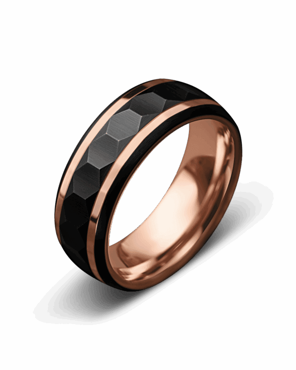 The Siena ring combines refined artistry with bold structure. A single hexagon-faceted brushed black center is framed by warm rose gold lines, adding balance and contrast. Brushed black edges complete the look, while the polished rose gold interior enhances its sophistication. Siena embodies strength with a touch of elegance, making it a timeless statement piece.
