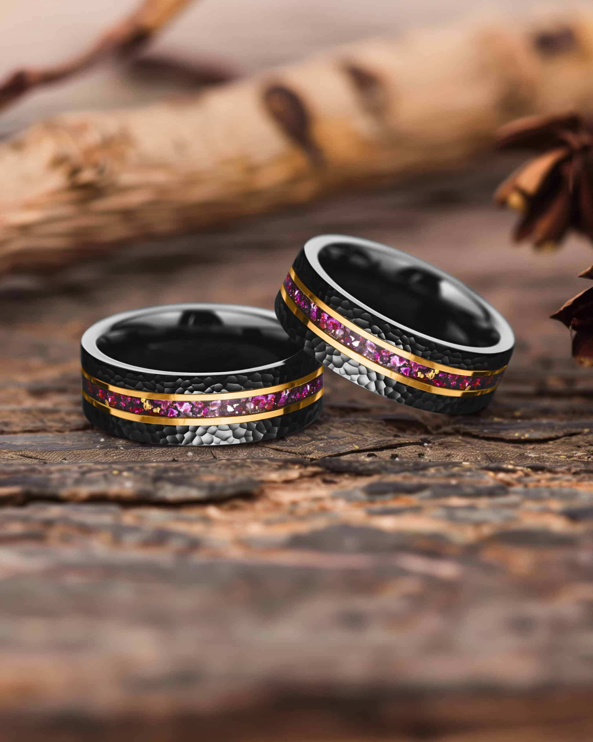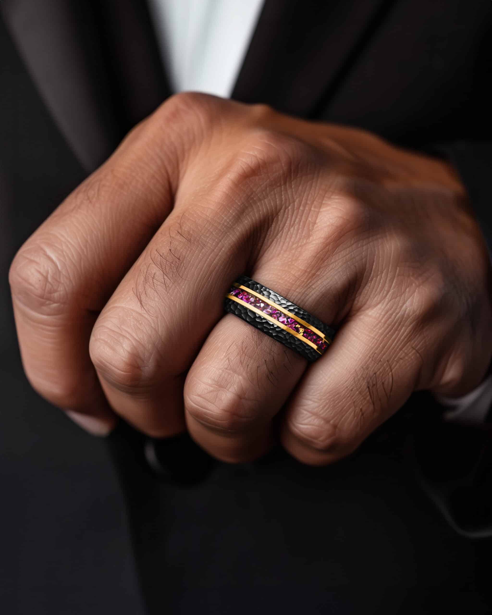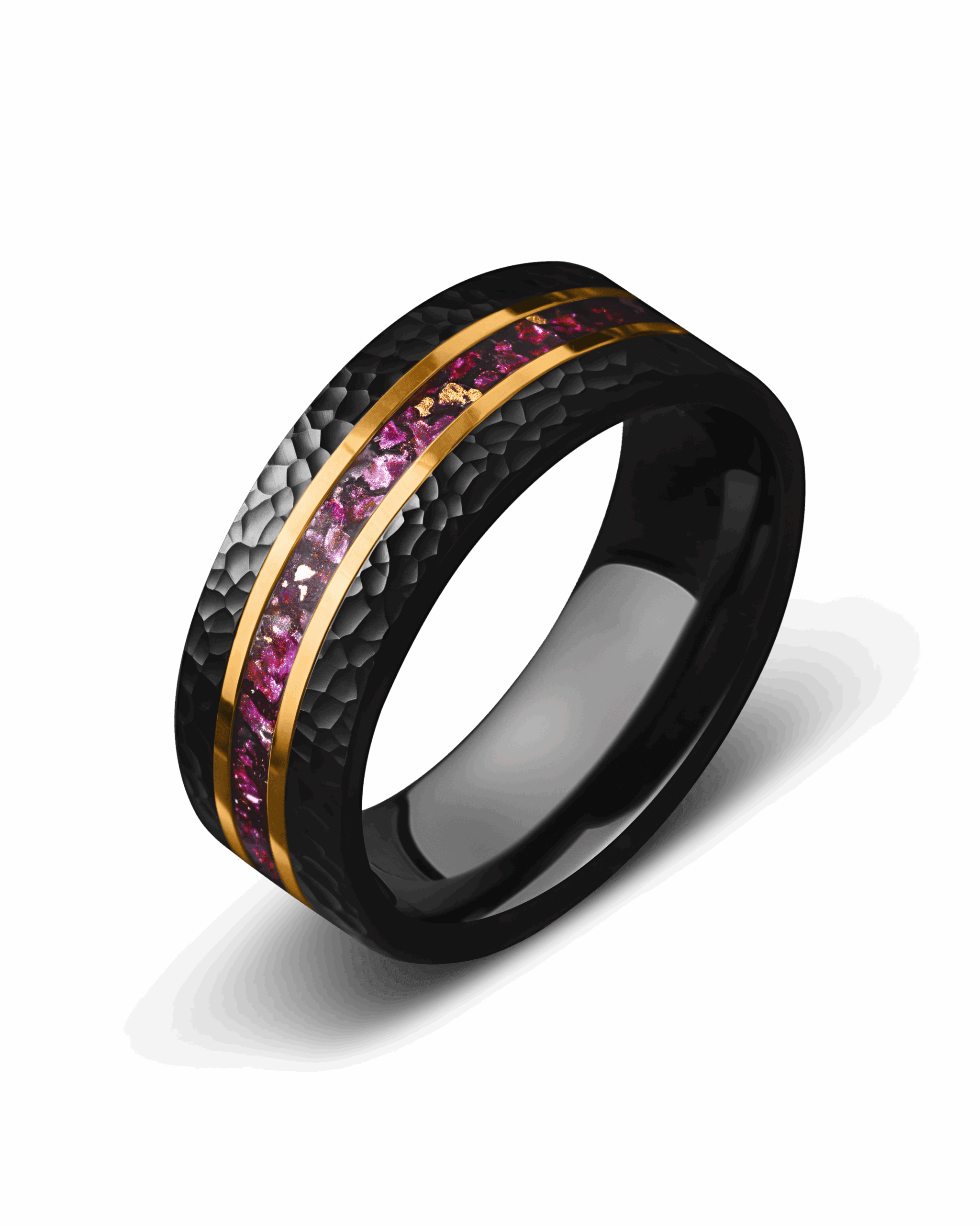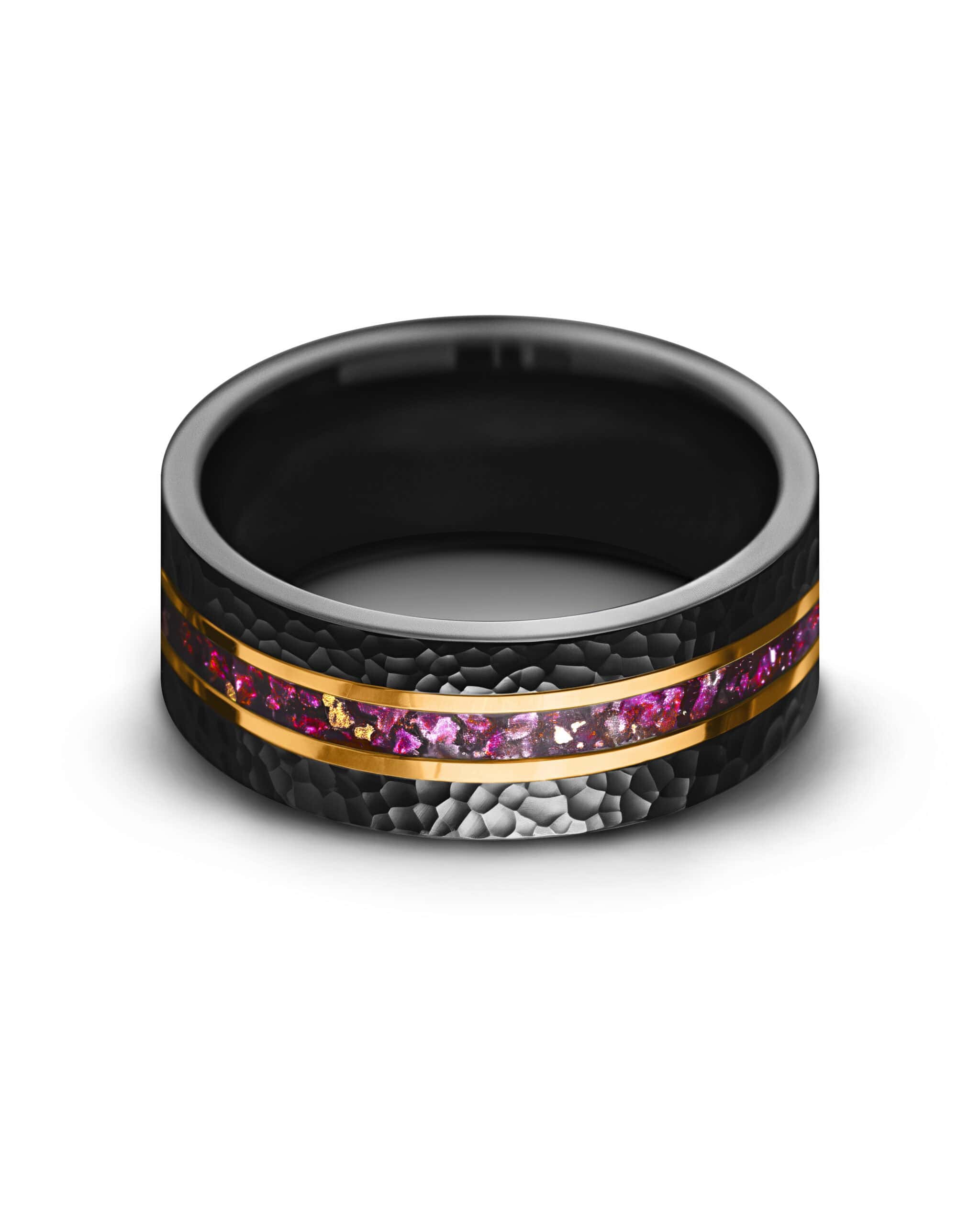 Oracle embodies mystery and insight through bold contrast. The brushed black hammered tungsten surface gives the band rugged depth, while the flat profile adds modern refinement. At its core, an inlay of crushed amethyst infused with flecks of 18K gold leaf shimmers with light and shadow, framed by twin gold-plated lines for brilliance. The design symbolizes clarity within strength—a guide of wisdom carried in enduring form.